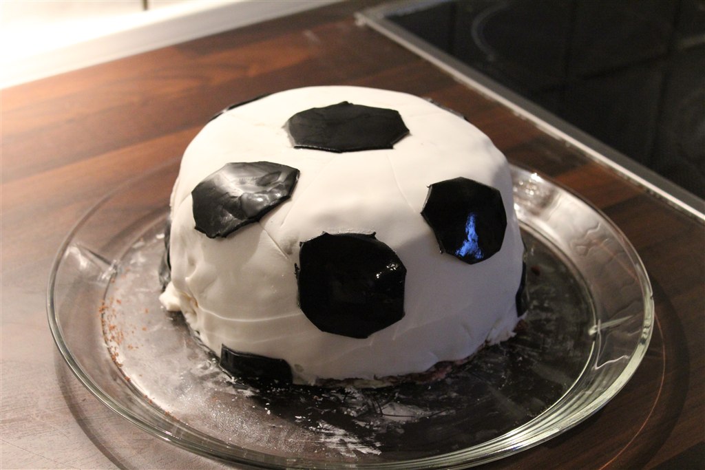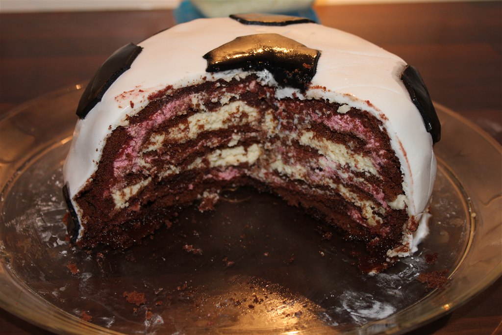 Lavede igår aftes hindbærmousse, og hvid tobleronecreme.. Og har nu lige lagt kagen sammen.. Det skal gerne ende med at blive en halvrund fodbold til drengene i aften! De skal se fodbold i tv..
