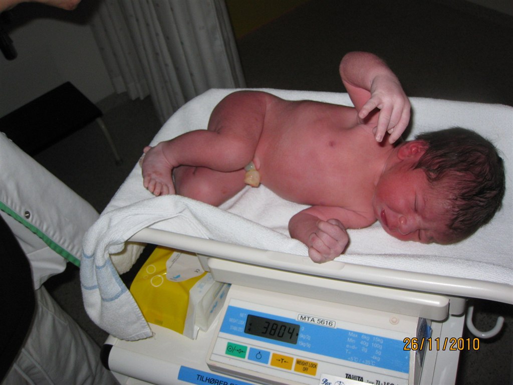 Han vejer 3804 gr. og er 54 cm lang. Helt vild dejlig.