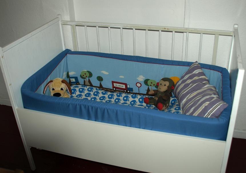 Men der var ikke plads til junior seng og vi ville at den lille kunne sove i tremmesengen indtil han bliver 2 og så kunne vi flytte dem til køjesengen. What to do?... Træmmesengen er hvid (den trænger bare til at blive malet) og min mand skaffede en hvide plade i den store skræld fra et skab eller et eller andet. Vi rensede og han har savet den i den rigtige str. Så han tog den ydeste side fra tremmesengen og han skruede pladen i stedet for, så sengen ikke ville falde fra hinanden. Jeg købte en sengerand fra Sebra (det var den perfekte undskyldig! Vi skulle lave en hyggelig "hule" til vores lille, da jeg læste, at de elsker små senge/tremmesenge og de søger hjørnerne og de giver tryghed!