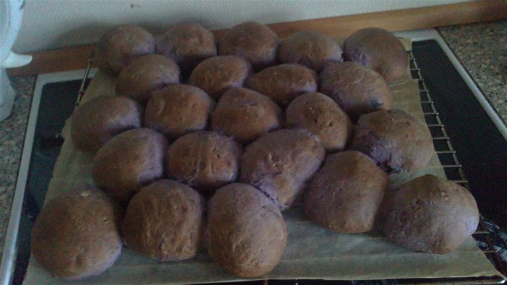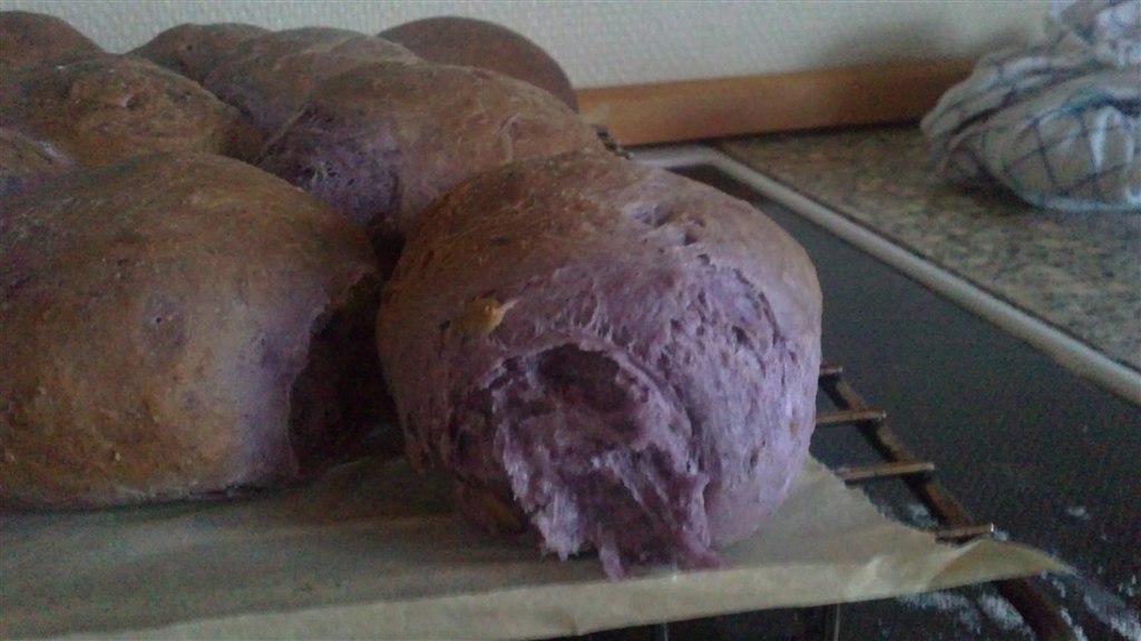 Som altid med mine farvede boller, ser de mere beskidte end farvede ud, men altså de ER lillae, i hvert fald inden i, og på de sider der ikke har fået direkte varme :D