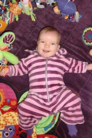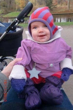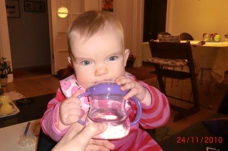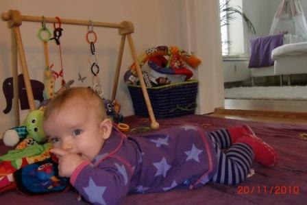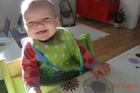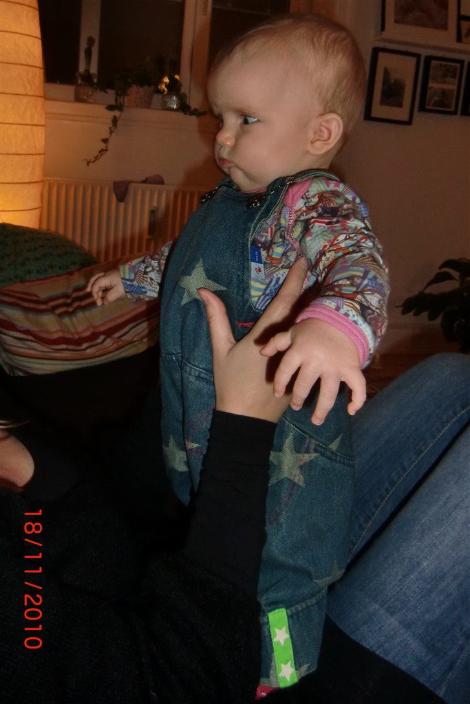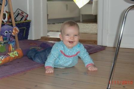Hun snakker, pludrer og tester stemmen hjemme og ude og det er så dejligt, at høre på. Motorisk er der også fart på, hun bliver stærkere hele tiden og sidder rigtig flot i sin højstol når hun skal spise. Den sidste måneds tid har hun øvet på at kravle, men der mangler lige lidt koordinering før det lykkes