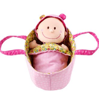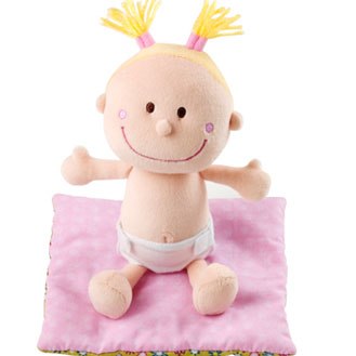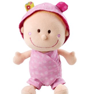 jeg har været ude at shoppe med min mor i dag, og hun insisterer på at det er tid til at pigerne får deres første dukker. så vi har købt chloé og zoe, små bløde dukker fra lilliputiens som ligger i en lille lift med et lille tæppe på; indenunder har dukken tøj på som er let at tage af, og indenunder det har den ble på.