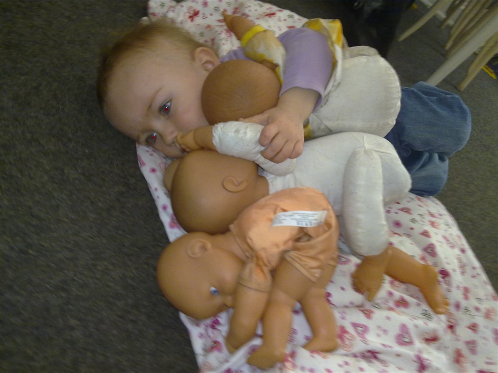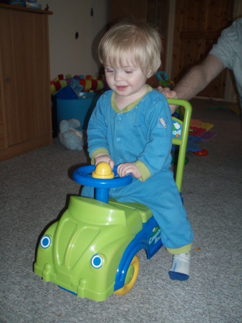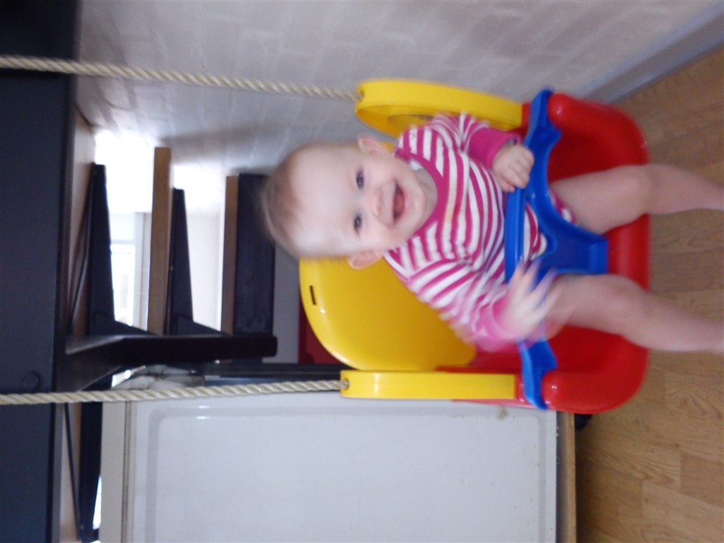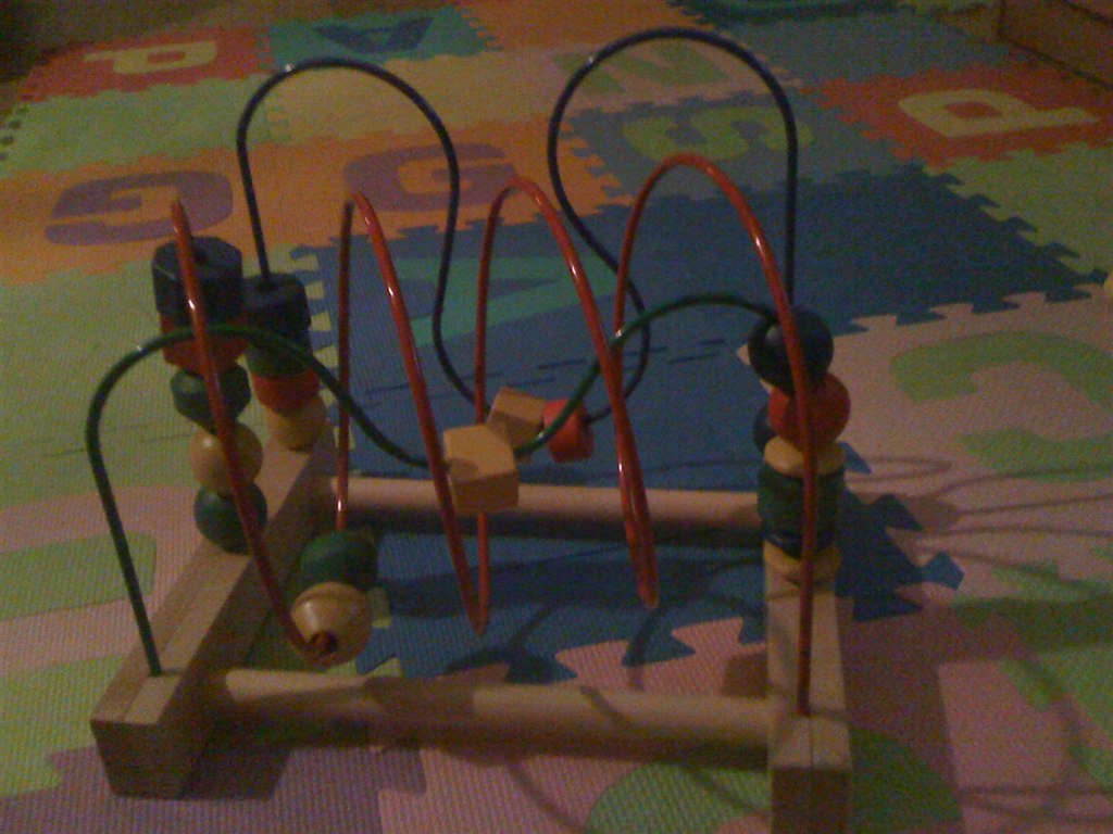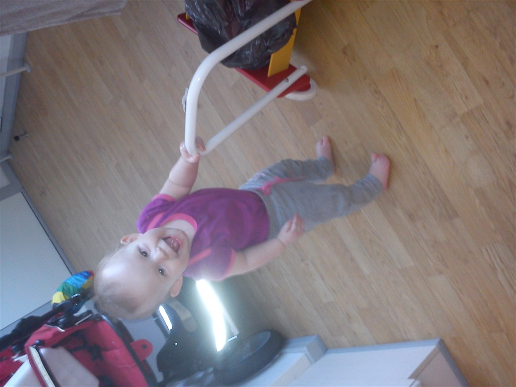 10. Kugleramme, den står tæt på hans seng og det er sket at vi har undret os over en mærkelig lyd i babyalarmen om aftenen, når han er blevet lagt i seng, og så viser det sig, at det er ham der ligger med sine små hænder ude mellem tremmerne og skubber på kuglerne i mørket