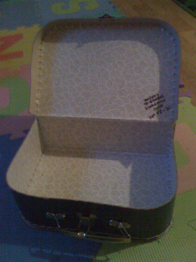 1. Rejsekuffert (Søstrene Grene) hvor vi skriver hvem han har været på ferie hos og hvor længe - der mangler to småferier at blive indskrevet.