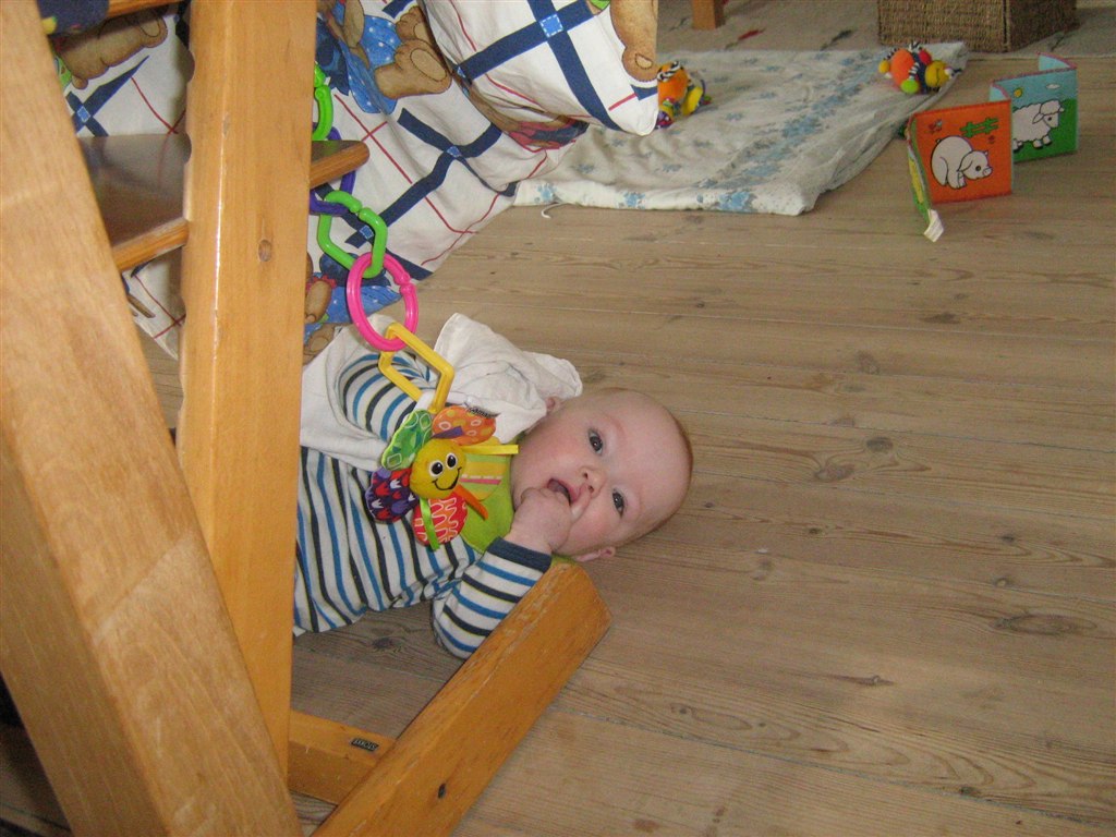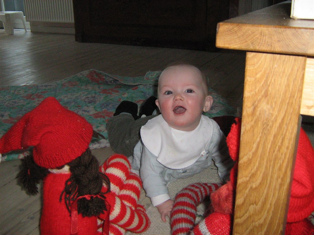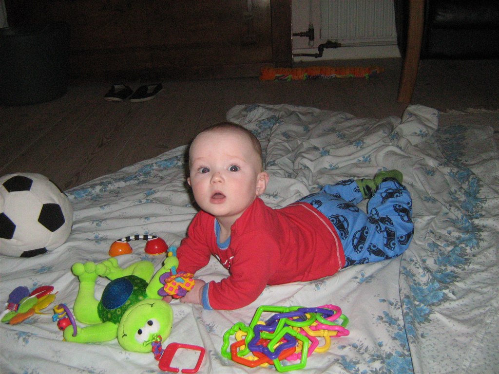 Han kan trille og øver sig i at kravle - gynger frem og tilbage mens han står på knæene og hænderne.