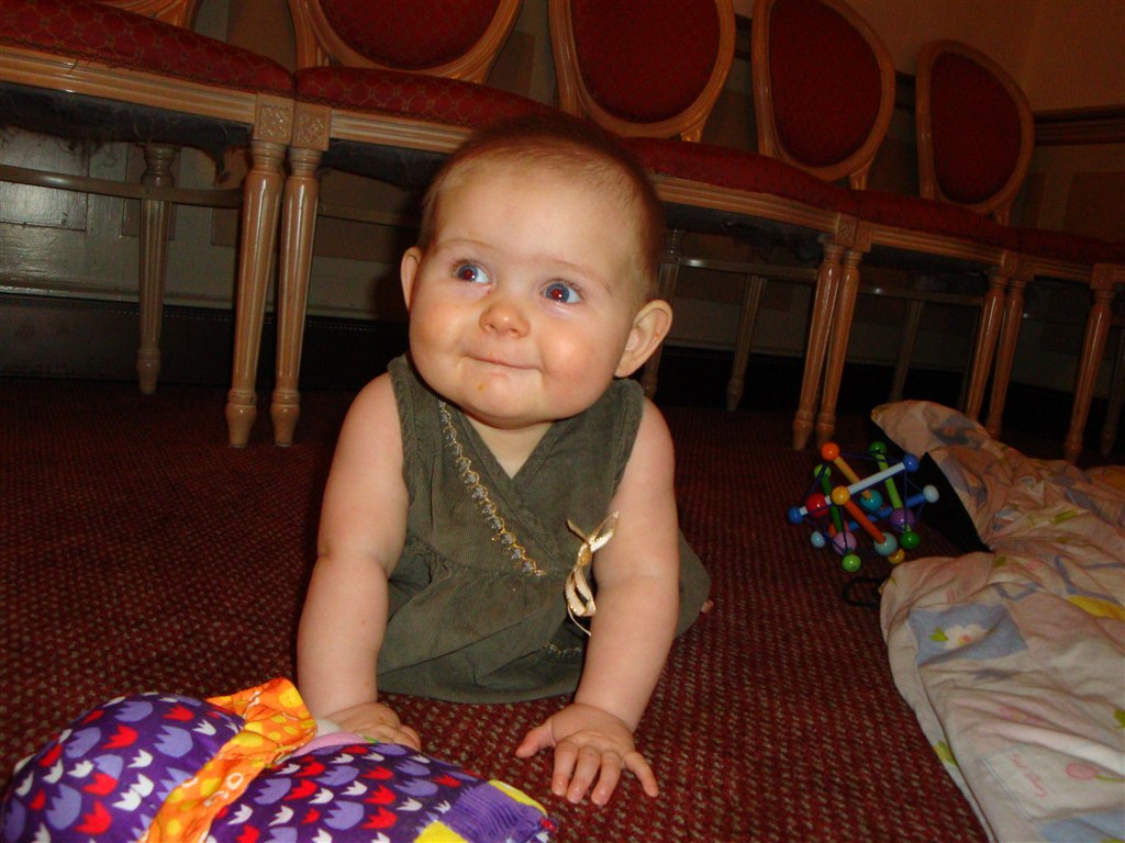 Hun er fremme, prøver på at rejse sig ved ting (kommer dog kun op på knæene indtil videre), sidder selv, kommer i kravlestilling, spiser selv mad med fingrene (pincetgreb), pludrer i stavelser, så hun har altså også haft fart på udviklingen..