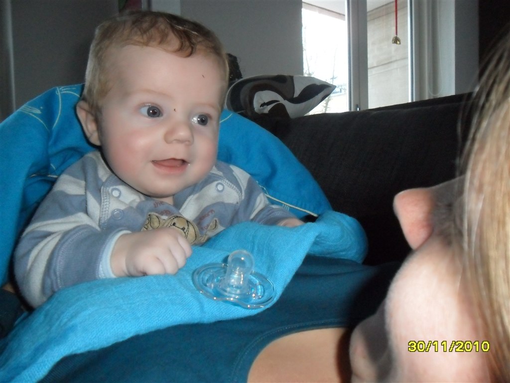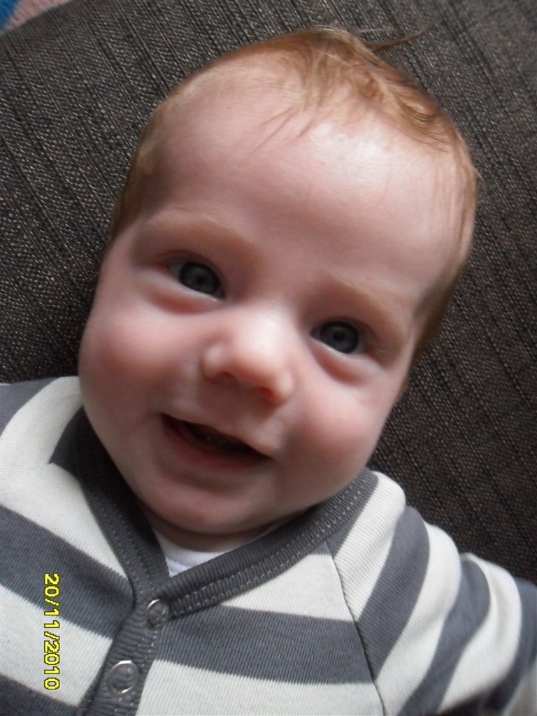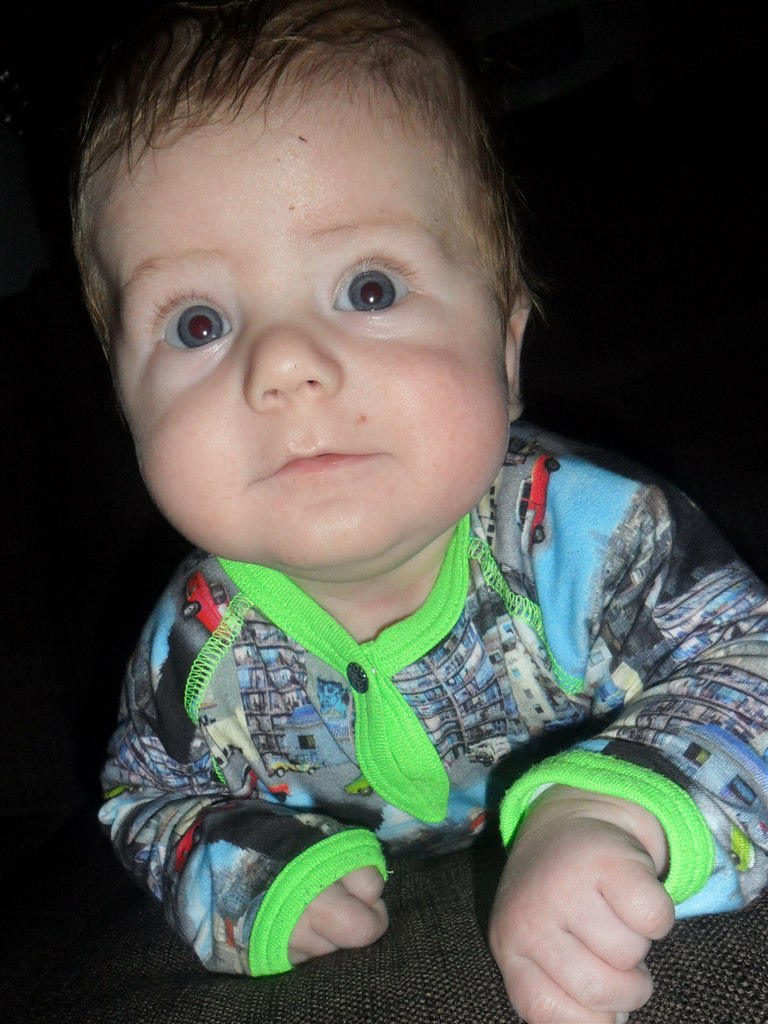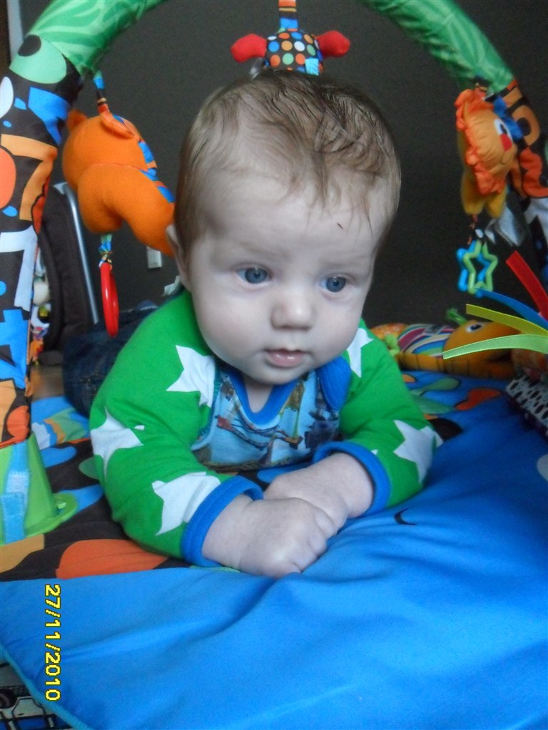 Han smiler og pludrer meget og er også god til at løfte hovedet, når han ligger på maven