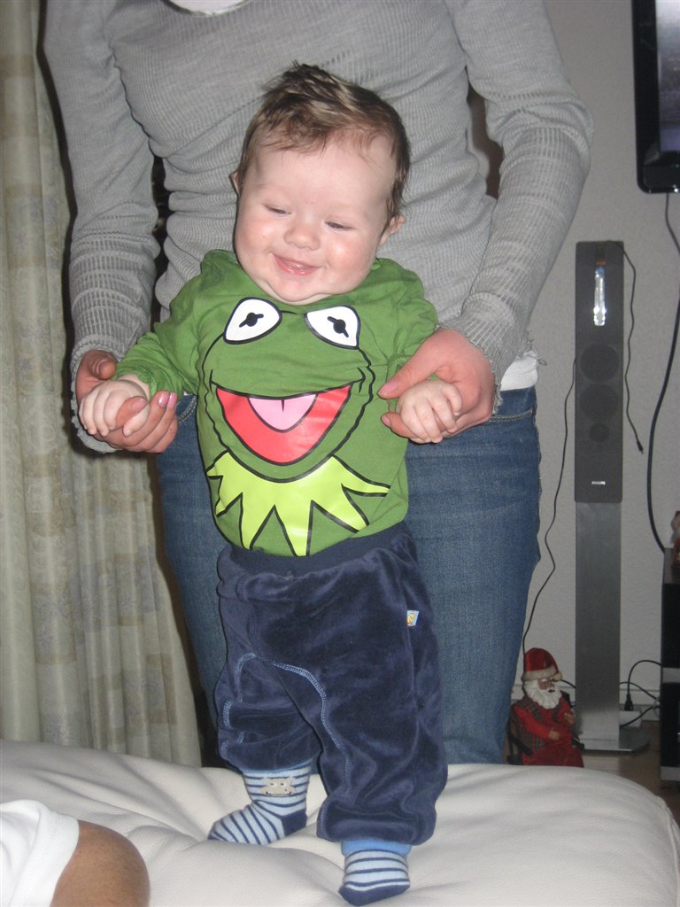 Han vejede 7.720 idag, da sundhedsplejersken var her. Også er han 66.5.cm. Og joooooowh han er sååå dygtig. Sundhedsplejersken sagde da i hvertfald at det skulle han slet ikke kunne endnu, men det har han kunnet i et stykke tid nu.. Han er meget stærk i benene, den bette mand!