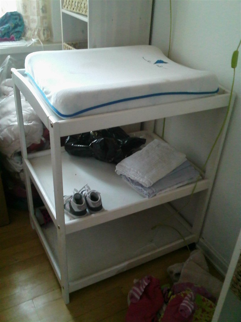 - Puslebord, hvid, med hjul, 2 hylder, brugt til 2 børn. Har lidt skrammer, men ikke noget, der gør noget. uden puslepude. Pris 50 kr.