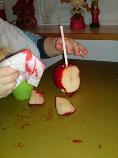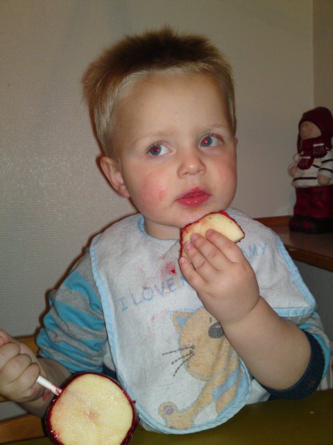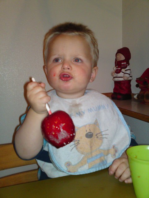 første bliver han hel vild da jeg tog posen med dem frem, så så han det, og lavede så et ansigt der s meget sjovt ud og sagde at det grisede (og han havde ik engang rørt det endnu) Jeg prøver at fortælle ham at det er ligesom slik, bare med et æble inden i. Han kigger på mig som om jeg må være åndsvag.