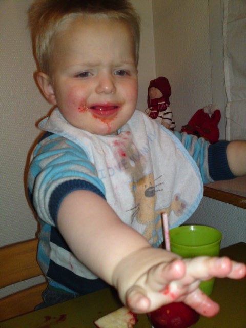 Jeg tager så et bid af ham, for at vise ham at det er ok, han kigger så lidt og tager så i mod det. Han sætter forsigtig tungen på det, siger så rigtigt kunstigt "MMMmm"