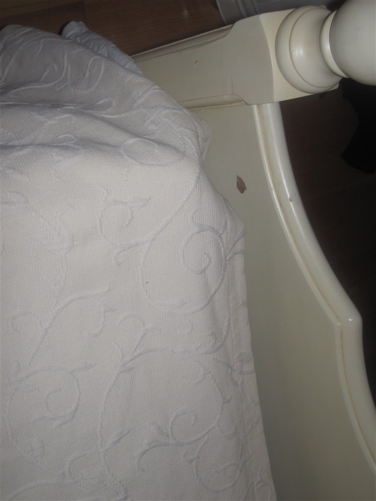 Den har en lille skræmme i den indvendige del af sengen i fodenden, kan dog ikke ses når man har sine madrasser i og evt. et sengetæppe