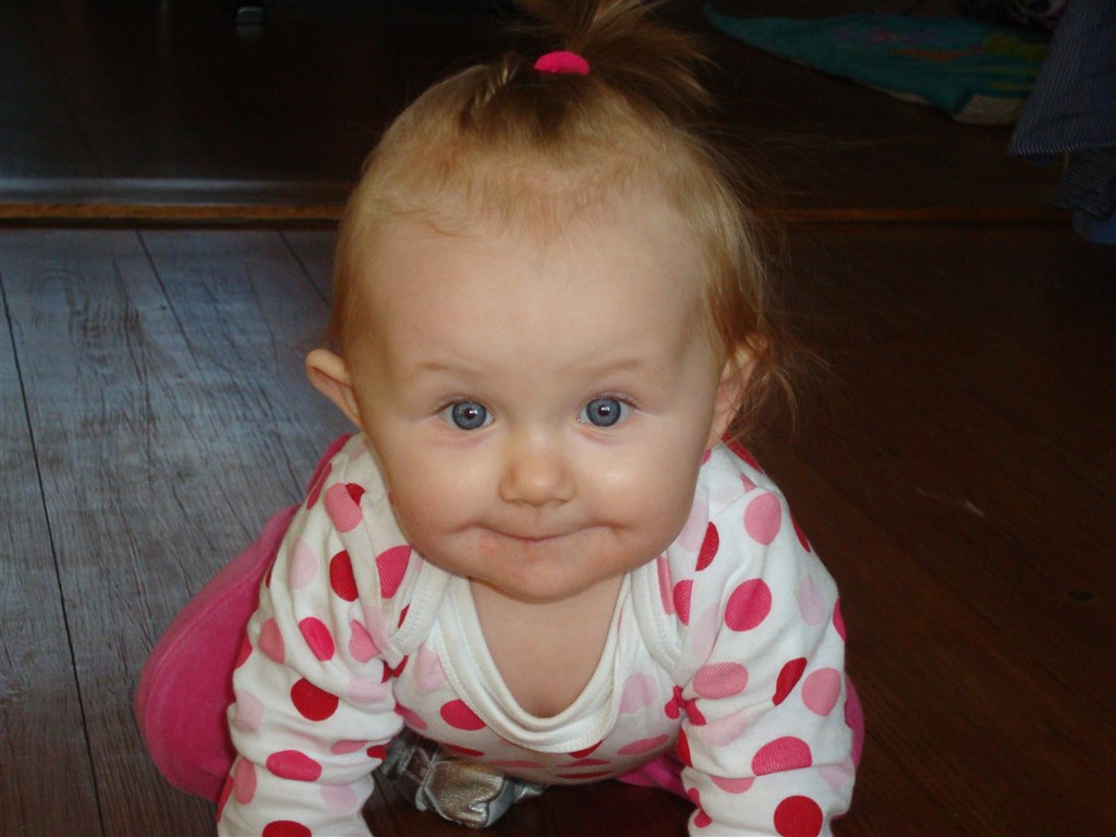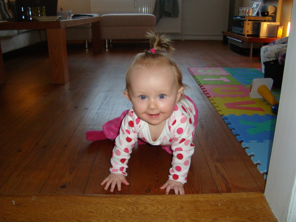 Det går bare fantastisk - nyder virkelig at gå herhjemme med hende. Tiden flyver afsted. 3. tand er på vej og Liva kravler (Læs spurter) rundt i hele huset - det er skønt