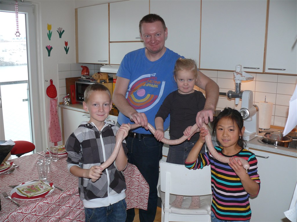 Nu nærmer juleaften sig med hastige skridt og jeg har lige siddet og kigget billeder fra hele december hvor der rigtig har været tid til at hygge ! Vi har fået bagt en masse og lavet konfekt og hvert år holder vi en julefrokost med et hold gode venner og deres datter hvor det er ungerne der selv laver mad helt fra bunden. De ska selv bage brød, være med på torvet efter fisk, stege frikadeller og ikke mindst selv lave medister ! Specielt det at lave medister er det helt store tilløbsstykke hvert år! Det er simpelthen så hyglig en dag og ungerne elsker at få lov at være værter og selv være i køkkenet (selvfølgelig med hjælp )!