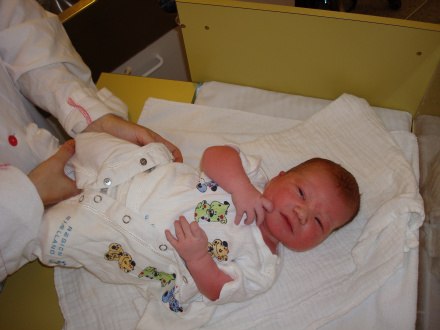Jeg fik det dårligt fra ca kl:16 migræneflimmer mega ondt i hovede og kaste op og på wc 5-6 gang og lave så hvile/sove jeg til kl:18,30.Da jeg vågne have jeg det meget godt dog tung i hovede.Vi hygge så med lidt rugbrød og steen søn.Jeg sagde til steen måske jeg føder i aften eller i nat kunne da være rart og sjovt nok.Steen sagde kan jo godt ske for nu har du en tid om af ringe om af bleve sat igang(ro på det).Vi hygge så med film på tv 2 og jeg var bare på wc nogle gange og tisse osv med et opdaget jeg blod slim gul osv faver over nogle gange.Fortalt steen jeg tro det blever i nat/morgen.Nå men vi hygge så vider med steens søn/min bonus søn (Vi have lave aftale om hans mor kom kl:7,30 og hente ham).Så vi hygge bare med ham i stuen med to madrasser på gulve og kl: var ca 00.30-00.45. Steen og hans søn sov næsten med det samme.Jeg kunne bare ikke soveeeeee.. Jeg have uro i maven, tisseri,blodslim mere og mere og ondt/snyde veer troede jeg efter tænkte jeg nu må jeg viste heller vække steen for syntes der var tætter og tætter imellem ca 1½ time.men tænkte også jaja og om lidt har jeg bare mens smerter igen som ugen her have gået med snyde aften veer nogle timer og med et bare mens smerter. Nå men jeg vække så steen ca kl:02 for de bide sgu nået de sidste 4 stykker og ca 5-7 min imellem syntes jeg. Ja og med et fik vi set af jeg have ret for kl:03 var der kun 3-4 min imellem. Steen fik ringe til Tina Alexanders mor(min bonus søn).Men hun nået ikke af komme før 10-15 min efter vi var kørt for med et have jeg 2-3 min imellem så Steen og Tina aftalt vi bare kørte så hente hun ham. Så vi kørte herfra ca kl:03,40.Var på sygehuse kl:04.00 og der fik jeg så lave ctg og den sagde 2½ min imellem over 20-30 min.Fik pulse osv. Fik dem mere og mere tæt og mit vand ville ikke gå Jeg var 3 cm åben skuffeeeeeeeeee tænkte hjem igen så.Men nej var smørblød og igen livmoderhals kun en lille drille kant som hun sagde. kl:05.25 gode veer 4-5 cm åben+spændt hindeblære går meget rundt med steen ringer og ringer til hans nevø Morten som skal med til fødselen.Mega halsbrand og ondt i brystkassen og kvalme får link. kl:06.20.Er 5-6 cm åben + meget spændt hindeblære.Jdm ville helst have den selv springer gode veer tæt gør da ondt især i underliv pga den er så spændt med vand.Går bare rund sidder lidt står lidt. Kl. 06.55 7 cm åben.God hjertelyd. Nu gør det en del mere ondt og lyst til af små press det vand væk/ud.Den er også meget fyldt siger jdm. kl:7.25 strærk pressetrang under ve.Jubii 9 cm åben derfor.meget vand god hjertelyd.Jubii steens nevø morten på vej.. kl:7.45 vagt skifte kl:7.50 den nye jdm hedder Pernille Bech(Hun er en meget søde jdm).God hjertelyde 130-140.Få taget vand og en stor skylle grønt fostervandkom ud og hans hovede kom fint ned som hun skirver. Kl: ca 7.55. Morten kommer..JUBII han nået det. Kl:8.00.Nejjj det letteeee en tid men så kom presveerne avav.Hun måtte nogle gange press min livmoder op + den kom i klimme af og til. ... Kl:8.27 fødes min dejlig søn i en soa,Med skulderne på trævrs.Morten klipper navlesnoren som han ellers ikke ville.*SS* kl:8.35 fødes moderkagen skønnes 970 g,ns 80 cm,3 kar uterus stor men velkontraheret. kl:8.40.Men så går det lidt strækt.Jeg blever mere og mere svimmel og sløre syn pga blod mangle. Jeg får stik i røvbalden bløder en del 450 ml midster jeg.To piller i numsen og min livmoder blever skube op med en epis tampon..Så skal til lægen osv senere.Vise vi jo hele vejen igellem.Glæd for vi føde ham på sygehuse og ikke hjemme det kunne have endt galt. Han Vejede 4160 g og 52 cm uden bene blev trække ret meget/helt ud pga han have fået sprøjten ville hun/pernille ikke og dagen efter blev han lige målte 54 cm fandt de ud af.*SS*.