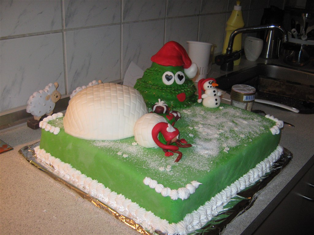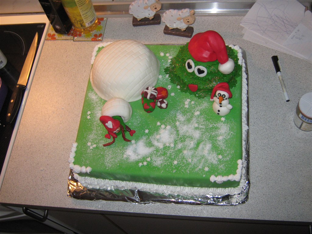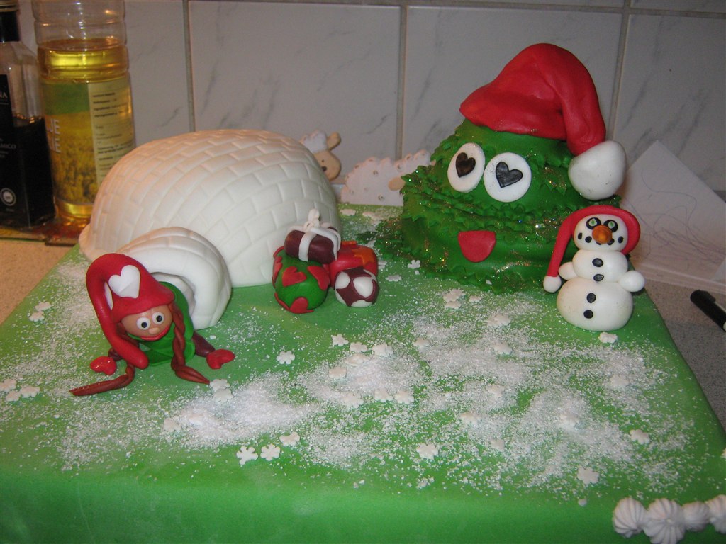 Fyldet i den nederste er chokoladekage med friske bananer og chokolademousse. I igloen var det vaniliebunde med noget karamel halløj. Juletræet er chokoladekage, men kan desværre ikke huske fyldet