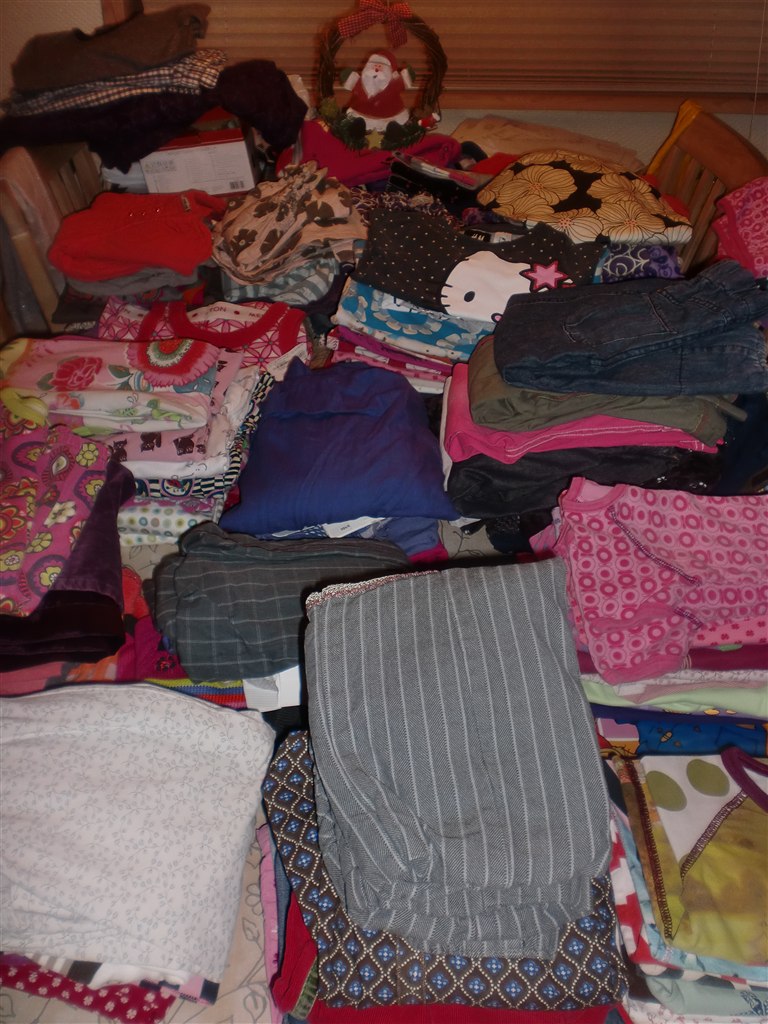 Prøv lige engang at tjek vores spisebord, da jeg kom hjem og fordelte julegave-tøjet i bunker af bukser, bluser, bodyer, heldragte og nattøj, mv.