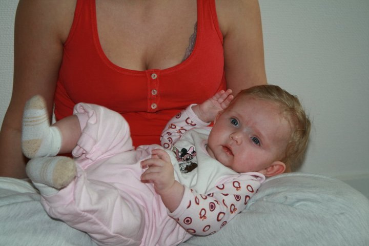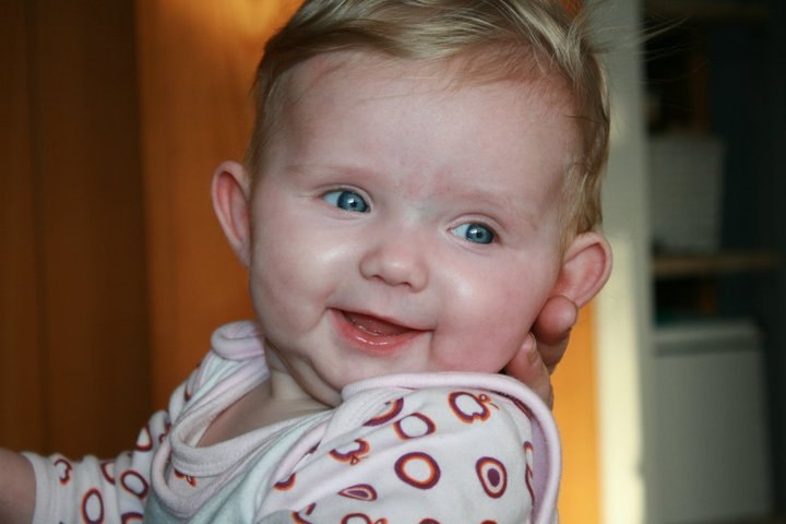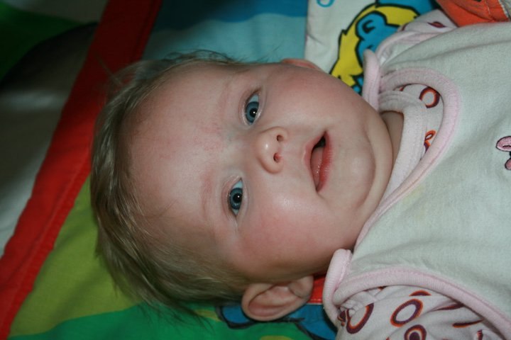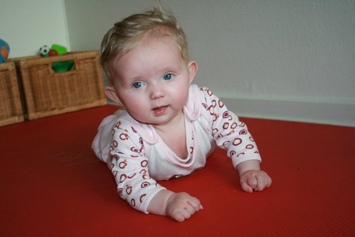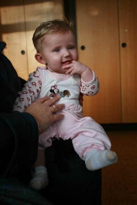 Hvor er hun bare sød, men hun ser ældre ud i hendes ansigts udtryk end 5mdr. og sikke en masse hår....