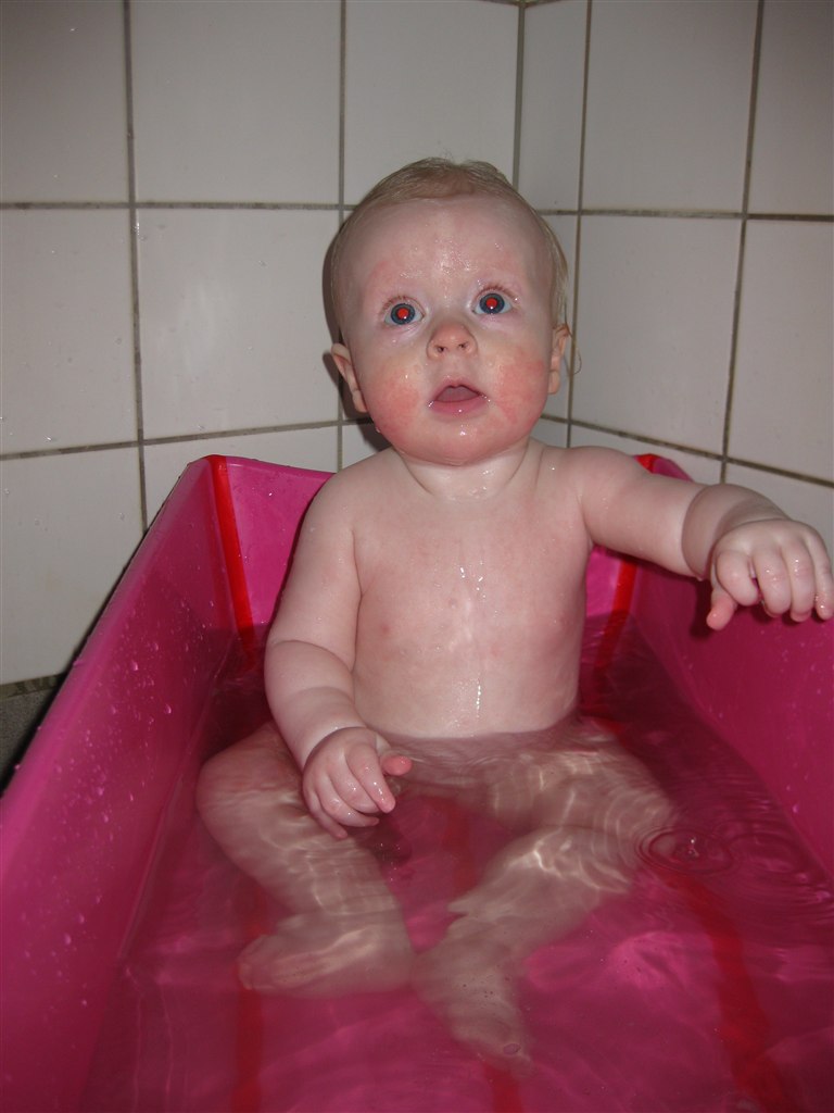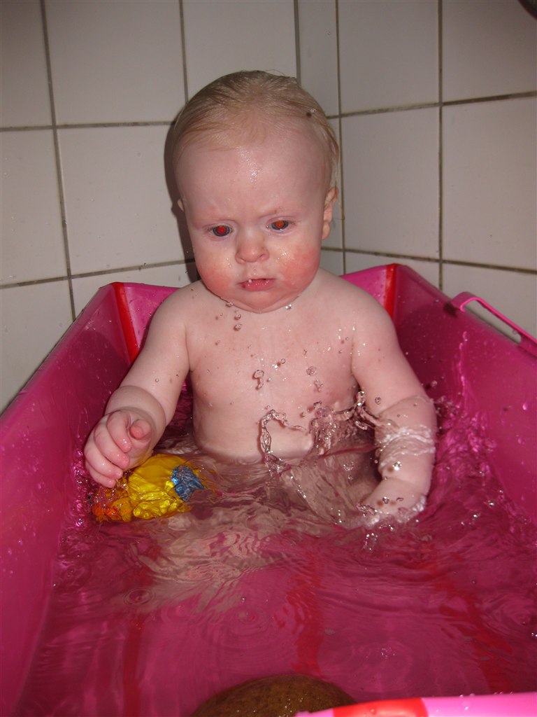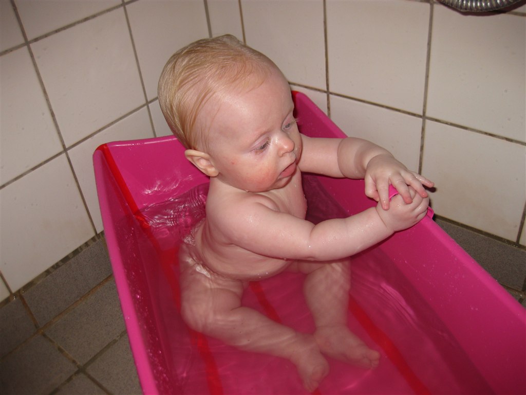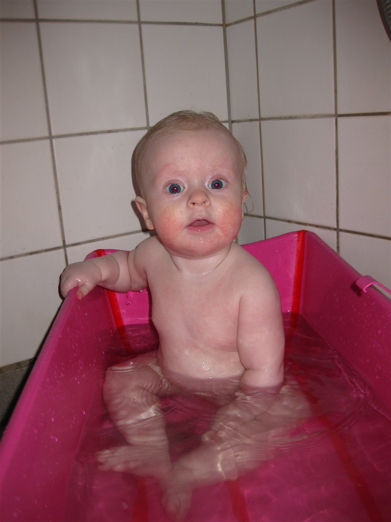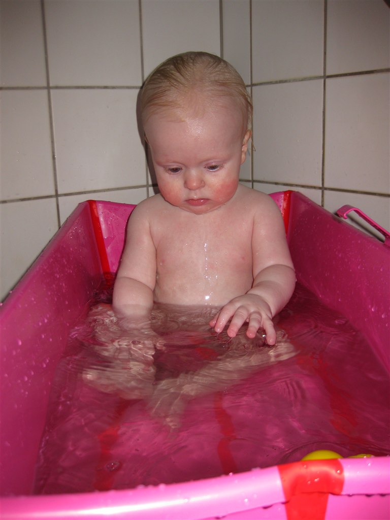 Haha.. Elsker billede 2.. Malou var oppe af badestolen for første gang her i sidste uge.. Hold da op hvor hun plaskede! Der var mere vand på gulvet og mig end i badekaret!