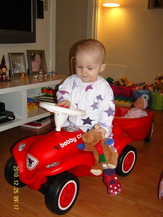 Legekøkken og legemadDukkevogn med dukkeGå-bilBrio togbaneLego DuploLegetelefon med lyd fra Fisher PriceXylofonKnoppuslespilScooter med anhængerTræ-kuglebane (som dem man ser hos lægen)Dyr fra SchleichGode børnebøger