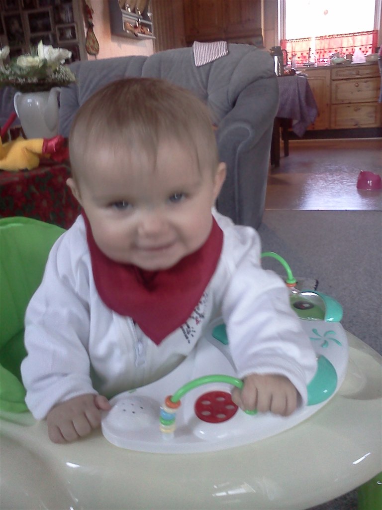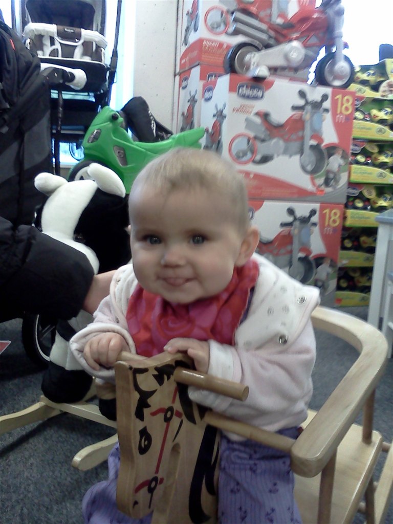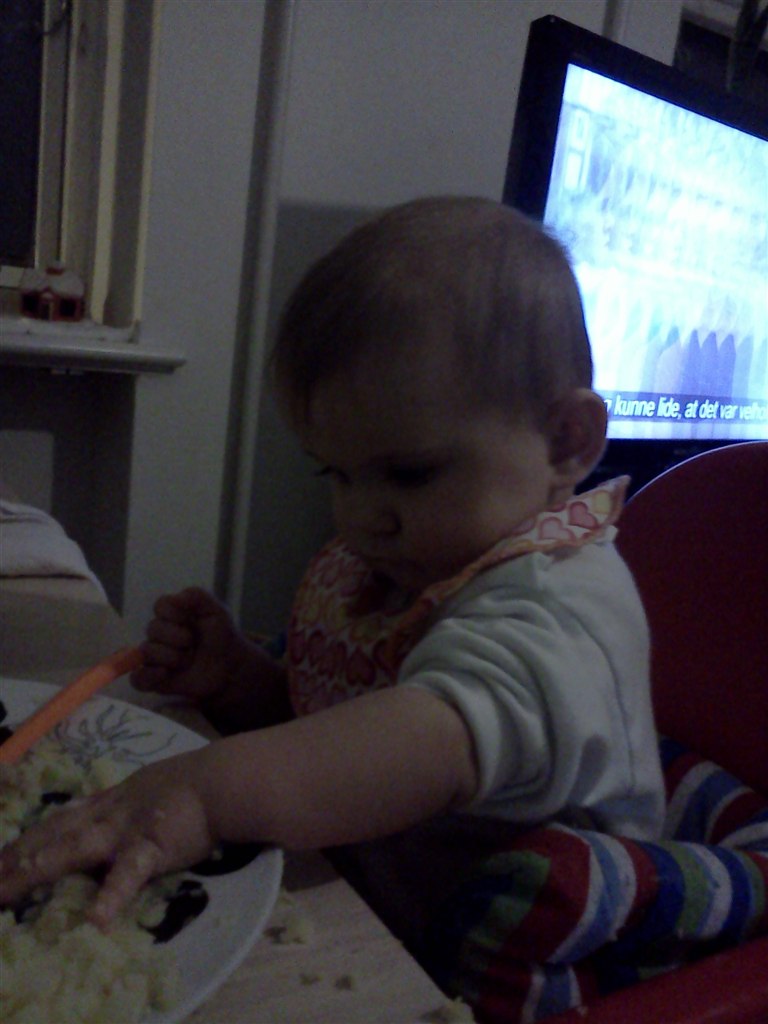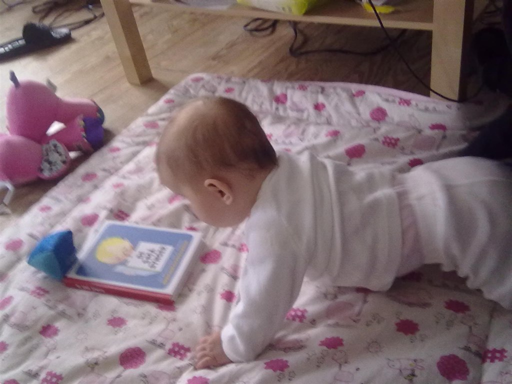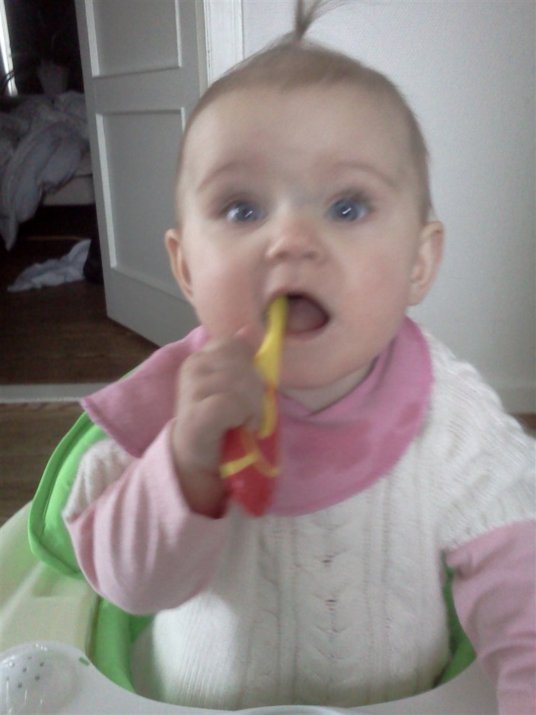 Nå men hun sidder nu helt selv (og mig som troede, at hun aldrig ville lærer det) og hun "kravler". Det vil så sige, at hendes måde at kravle på er, at hun stiller sig op på alle fore og kaster sig frem, op på alle fire igen og kaste sig ned osv osv