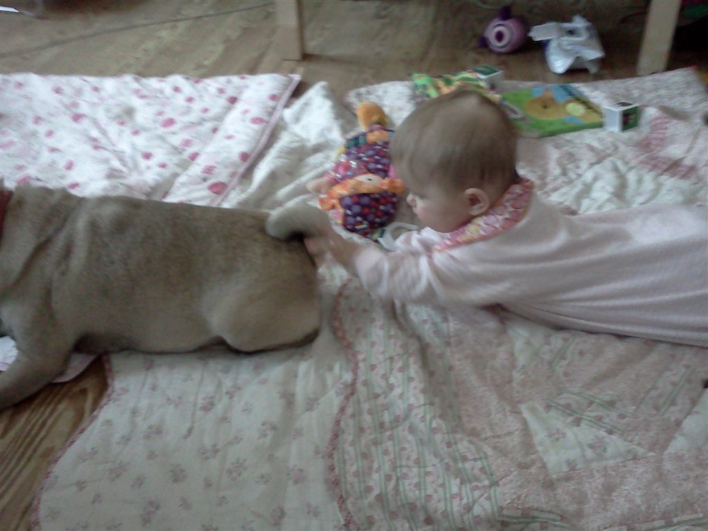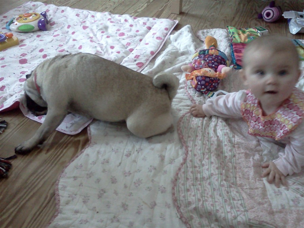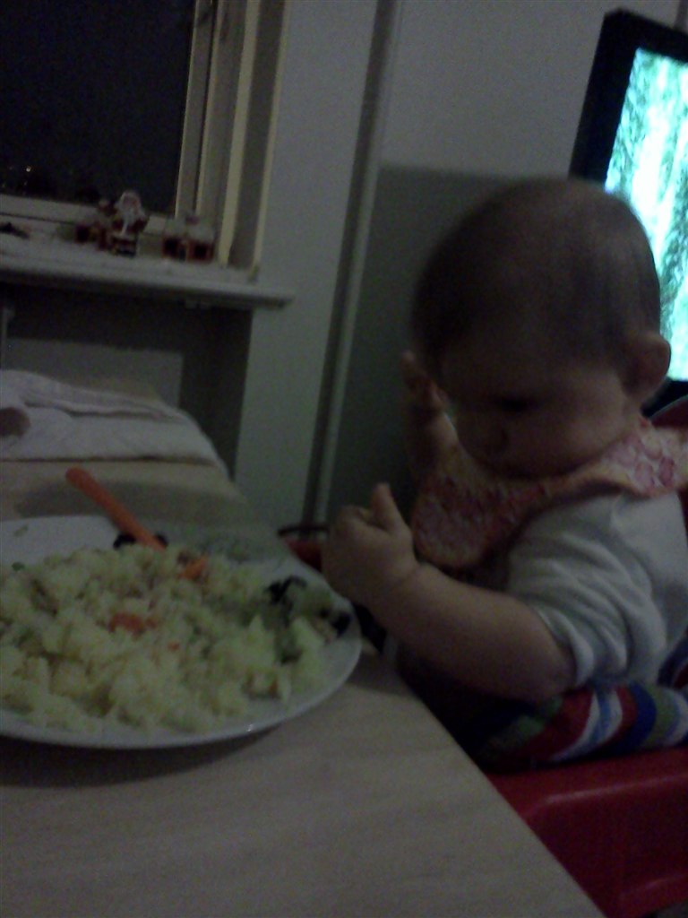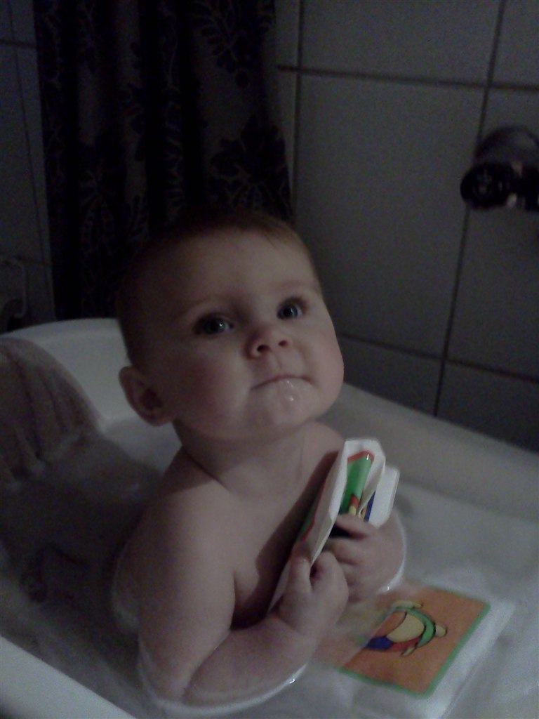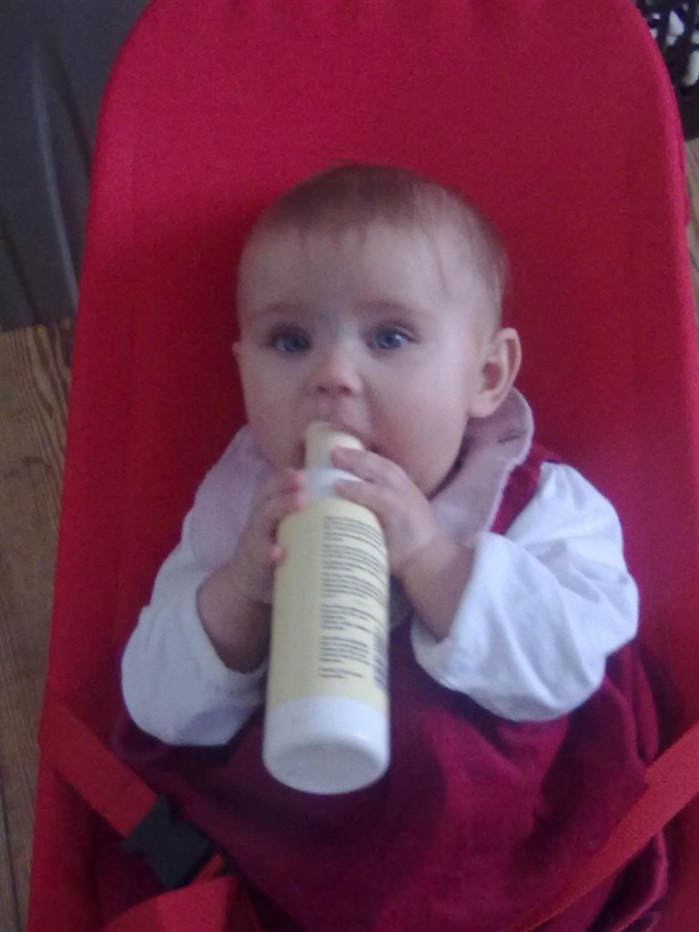 Nå men hun sidder nu helt selv (og mig som troede, at hun aldrig ville lærer det) og hun "kravler". Det vil så sige, at hendes måde at kravle på er, at hun stiller sig op på alle fore og kaster sig frem, op på alle fire igen og kaste sig ned osv osv