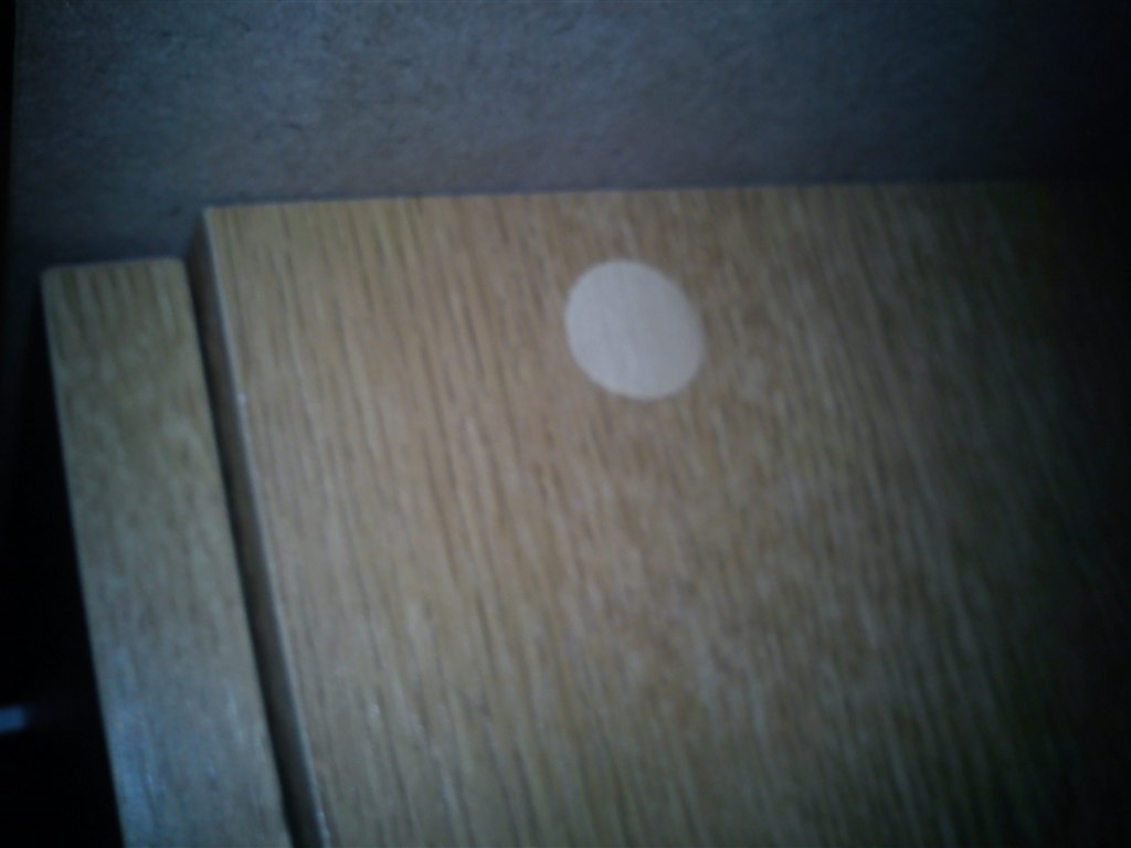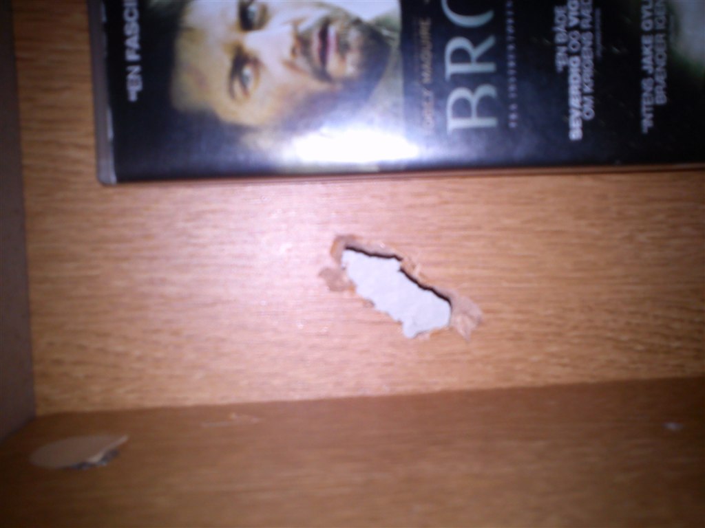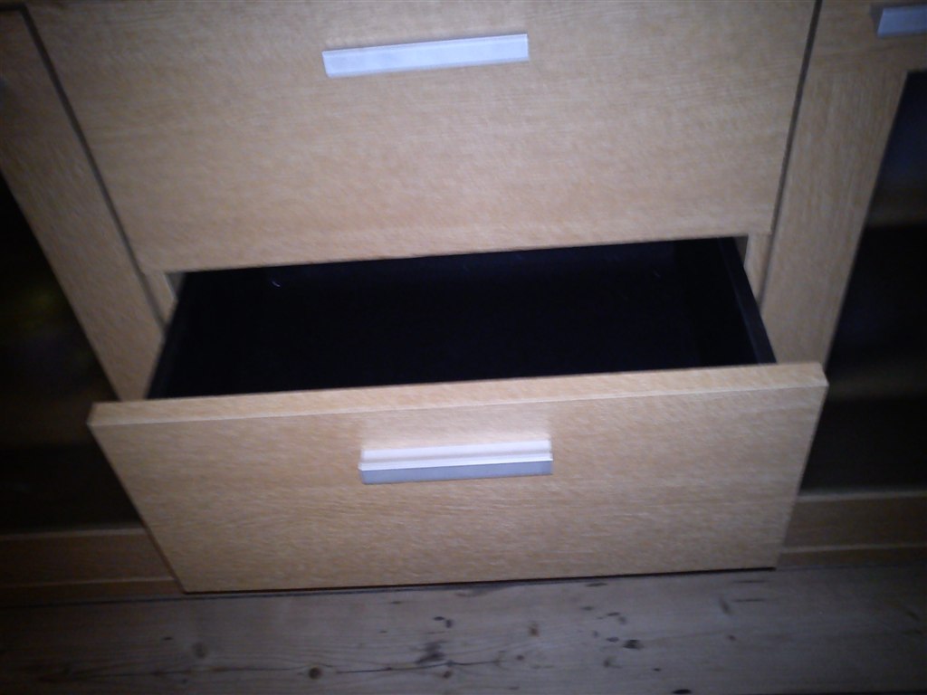 omme bag på er den revnet lidt, men absolut intet af betydning. glasset i lågerne er mat glas. foran skruerne inden i, er der dækket af mednoget laminat, der dog er lysere end selve kommoden. den er ufattelig tung! tænker jeg gerne vil have 500 kr for den, men kom gerne med bud