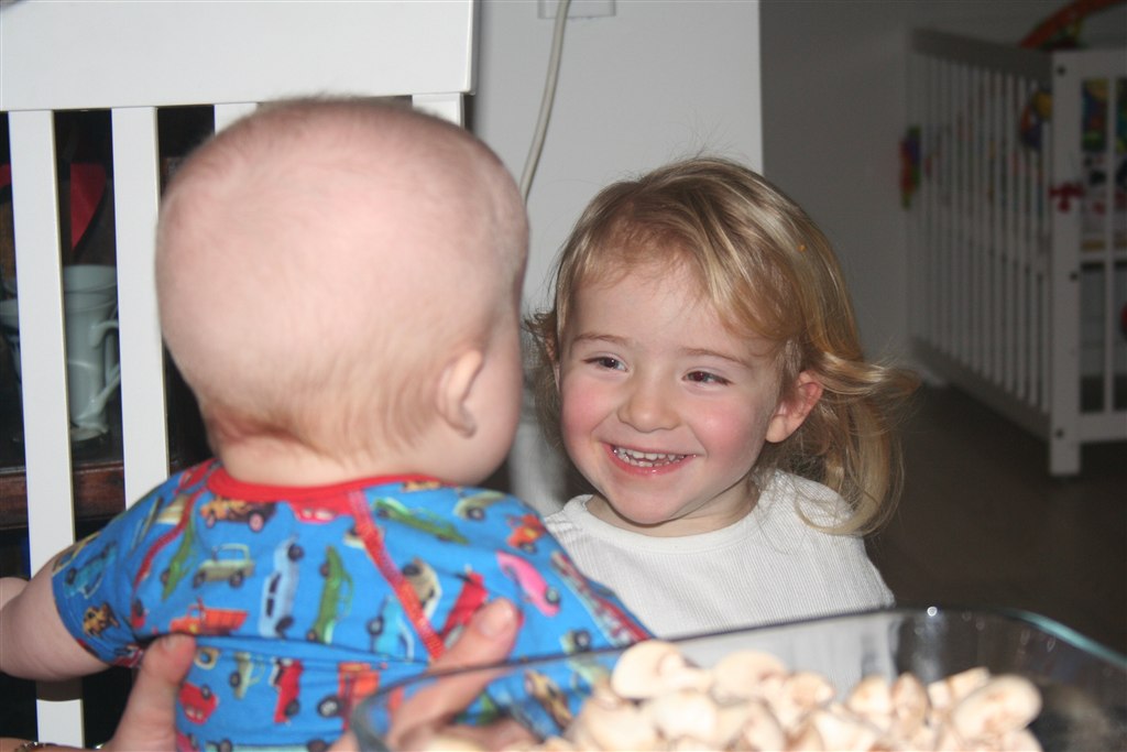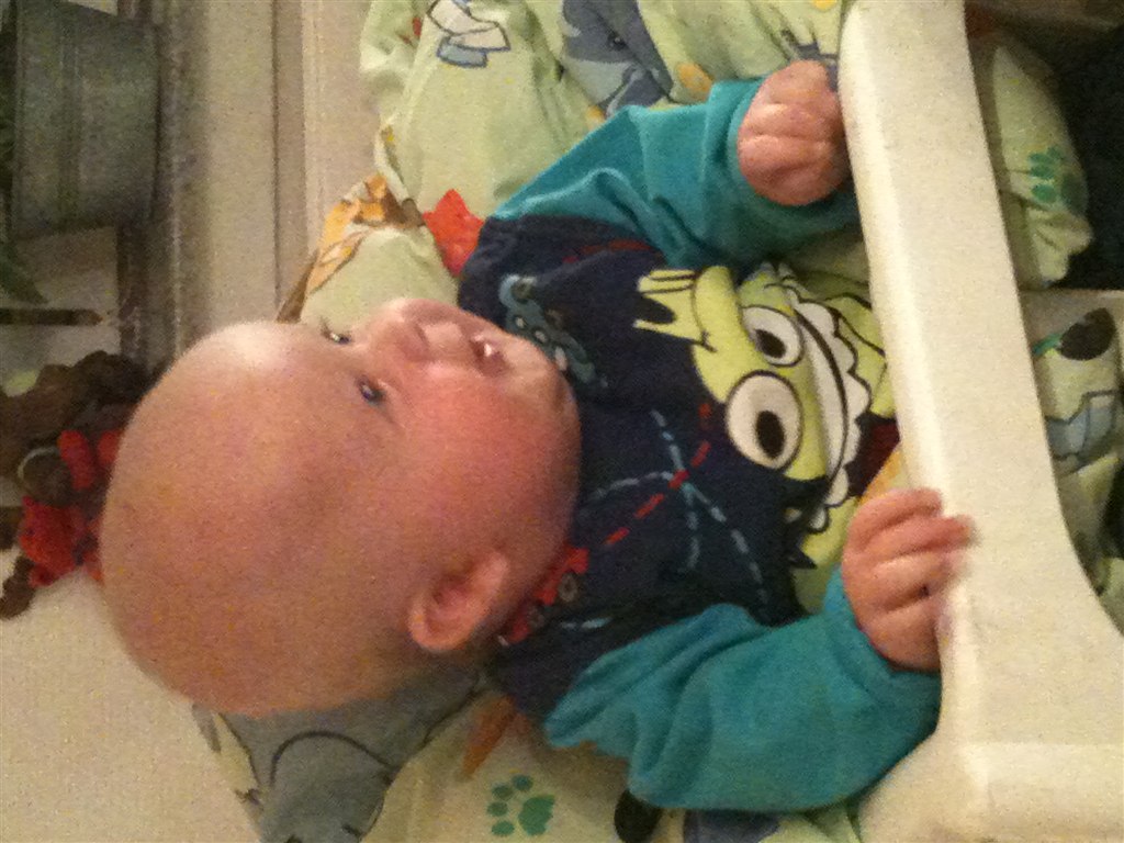 Han kan sidde i sin højstol og kan også snart sidde på gulvet.