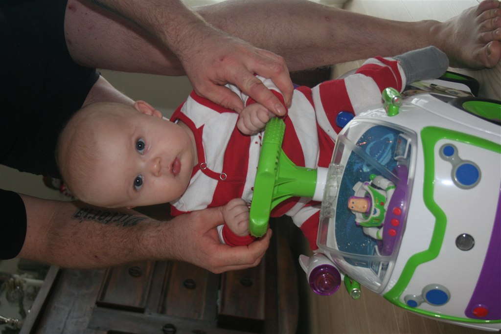 Han kan sidde i sin højstol og kan også snart sidde på gulvet.
