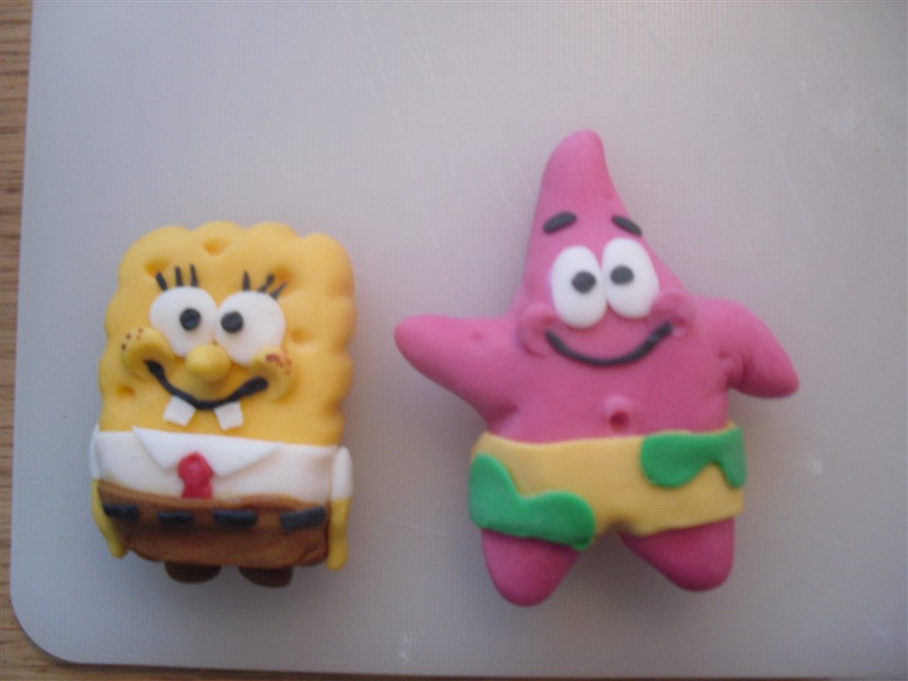 Så er jeg gået i gang med min søns første fødselsdagskage, og denne gang med figurer.. Det eneste jeg har modelleret før er sko til dåbskagen, men det var mere bare og samle en skabelon.. Er super stolt, selvom patricks shorts fik de forkerte farve, så først senere at blomsterne sku' ha været lilla, men men... (beklager billede kvaliteten..)