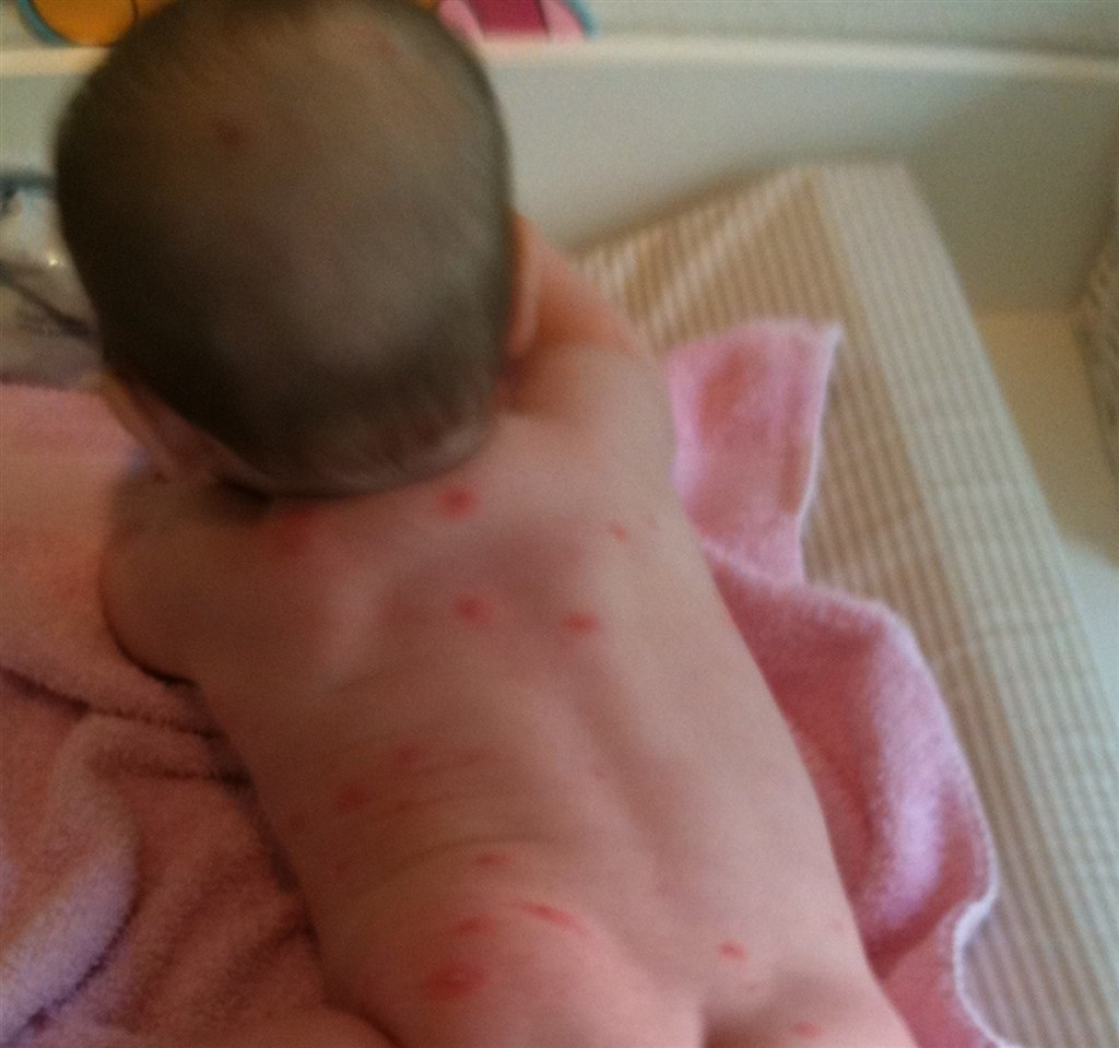 Sådan så det ud hos min datter. Det blev aldrig til mere end ca. 5 skoldkopper i alt. Så det var et mildt tilfælde, hvis det altså var skoldkopper...... Var forbi lægen med det og hun sagde det var skoldkopper, dog uden at undersøge det væsentlig.