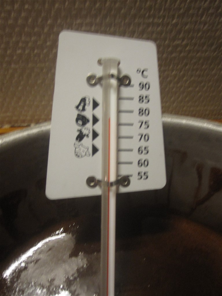 Smør, sukker og chokolade smeltes sammen over vandbad. Så er det frem med stegetermometeret, for massen skal varmes op til 85 grader. Det tager lidt tid. Så er det i med æggeblommer og pisk kraftigt - så deler massen sig. Tag skålen af varmen og fortsæt piskningen til massen samler sig igen og bliver tykkere. Lad den køle af.