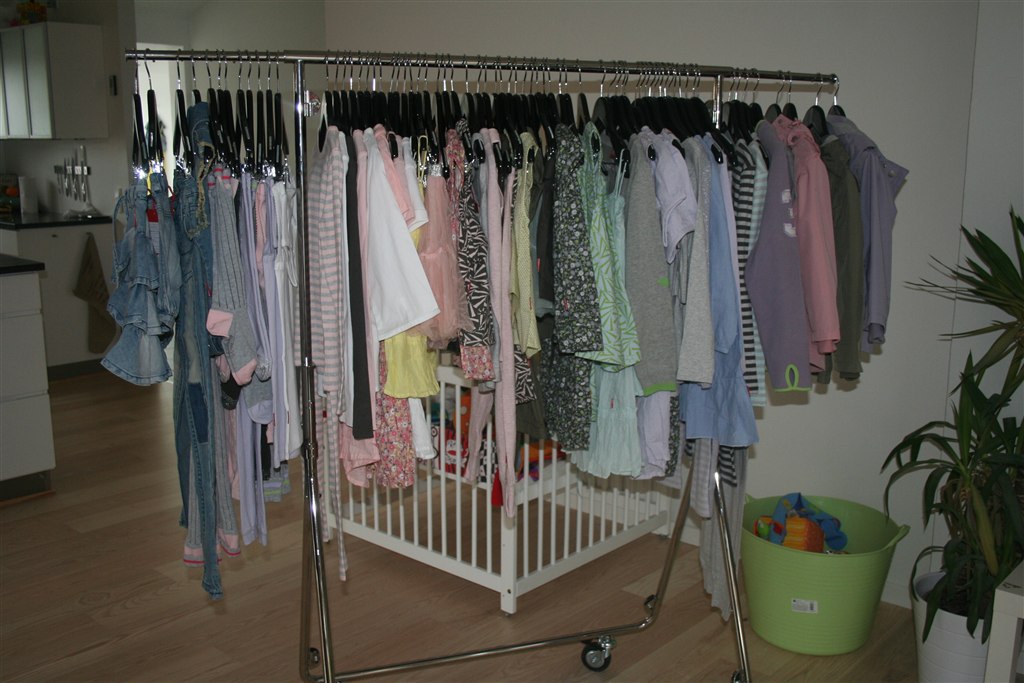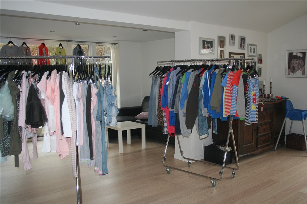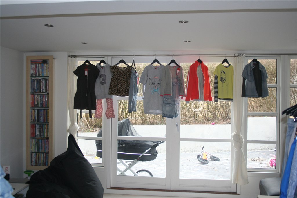 Min stue er forvandlet til showroom og jeg tror mine tøser føler de er i paradis, dog kan Emma-sophie ikke helt forstå hvorfor hun ikke bare kan bruge alt det tøj der hænger der???