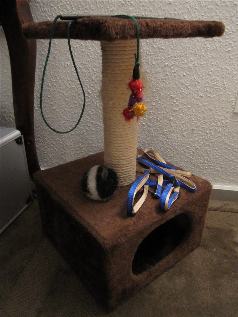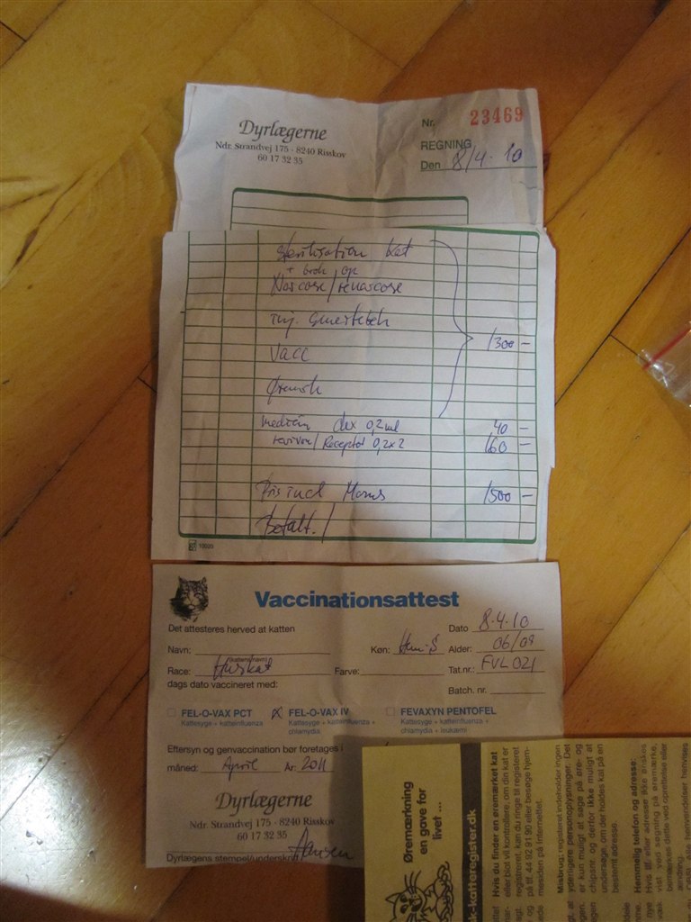 Katten er steriliseret, øremærket og vaccineret. Dokumentation herfor medfølger selvfølgelig. Også transportkasse og splinterny næsten ubrugt kattebakke med låg (+en uåbnet pakke filtre hertil) medfølger samt kradsetræ, legetøj og sele.