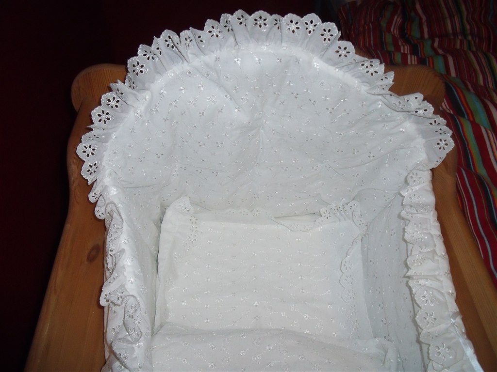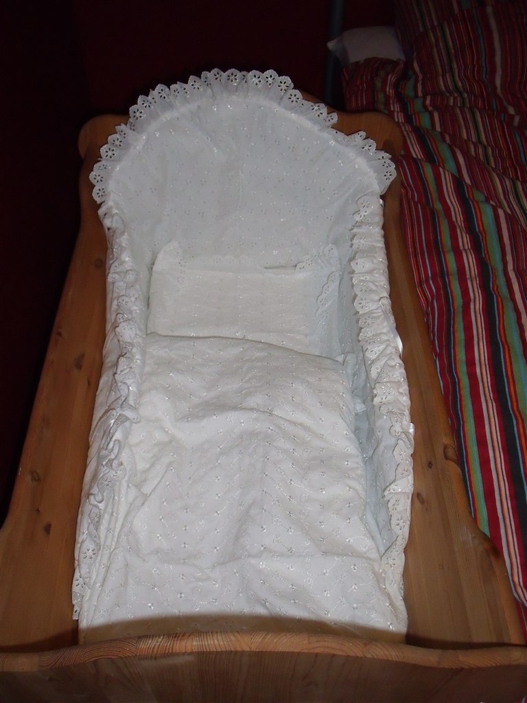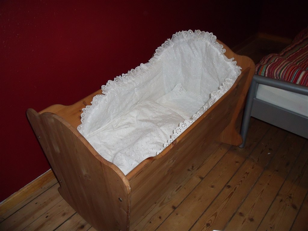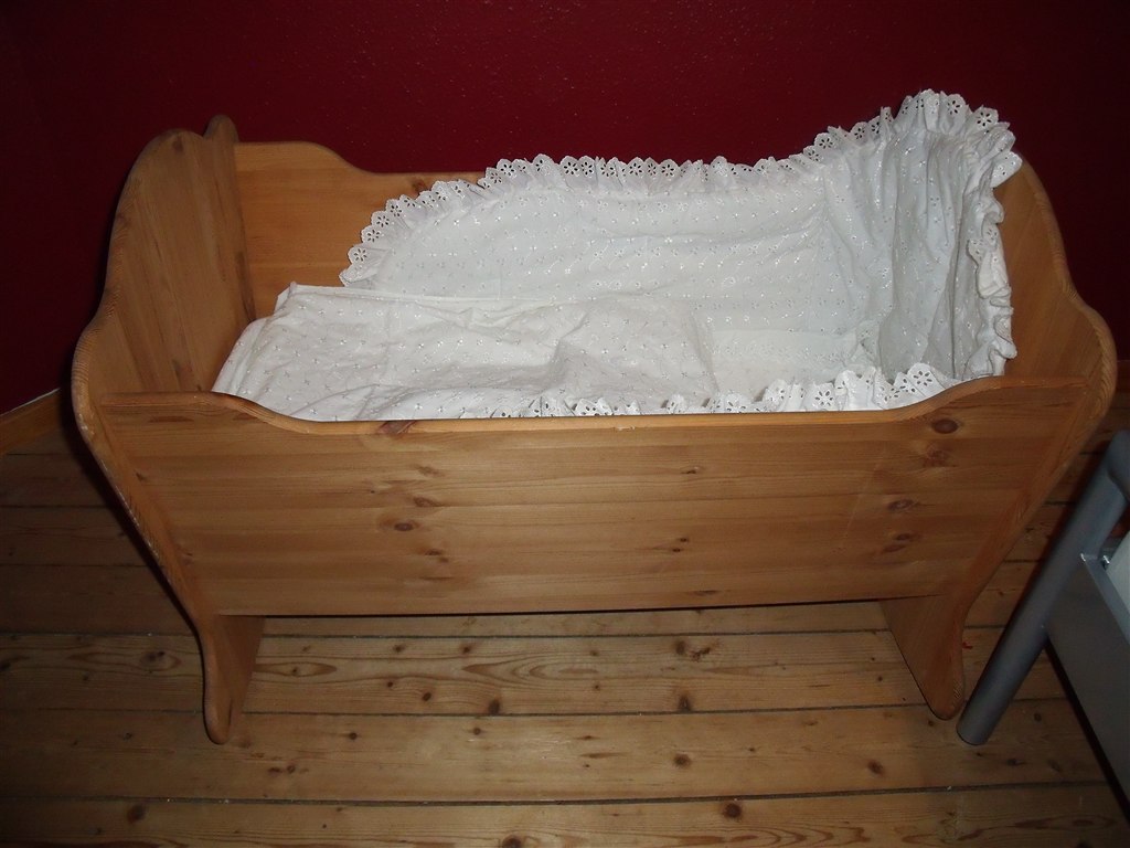 Velholdt trævugge med madras, sengerand og dyne/pudebetræk til baby, sælges for 600 kr.