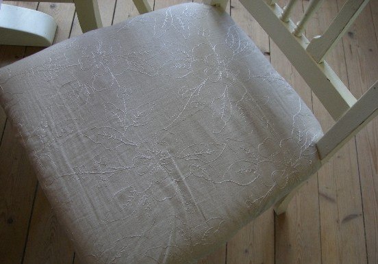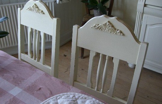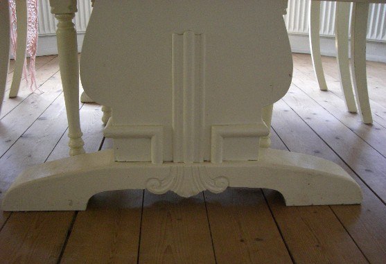 Rigtig flot gammelt hvidmalet spisebord og 4 stole i romantisk stil, bordpladen er en del ridset og trænger til en ny omgang maling, jeg har dog selv bare haft dug på. Noget maling kan være afskallet en lille smule hist og her på stolene, men for mig er det en del af charmen