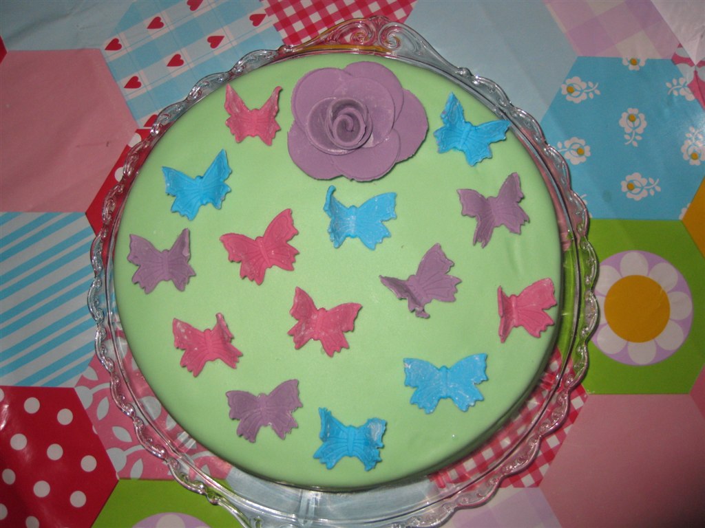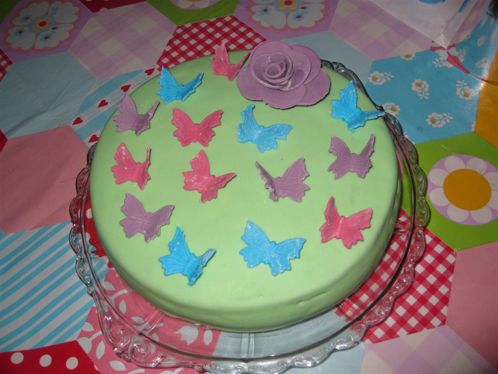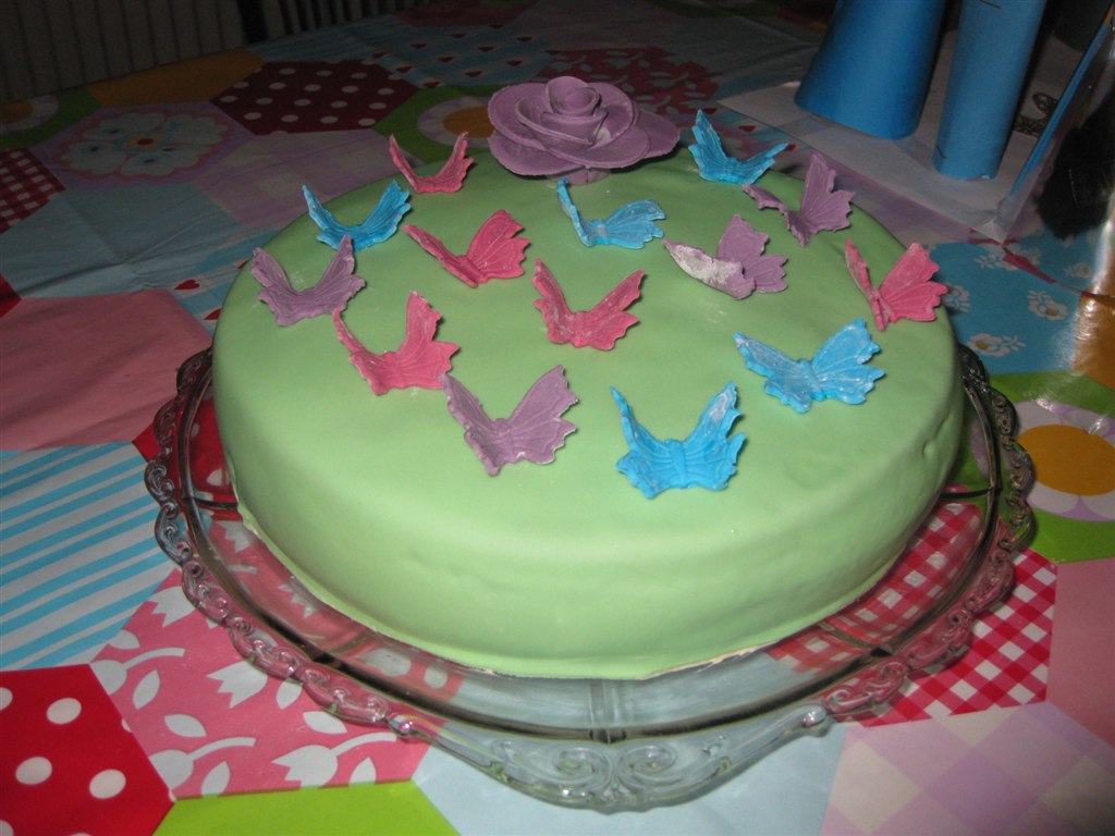 Wiiii....min første kage. Sommerfuglene fik en del flourmelis på sig, og jeg kunne ikke pensle det af. Men det er jo også min jomfru-kage. Glæder mig til at servere den om 20min og meget spændt på hvordan det der smørcreme smager.