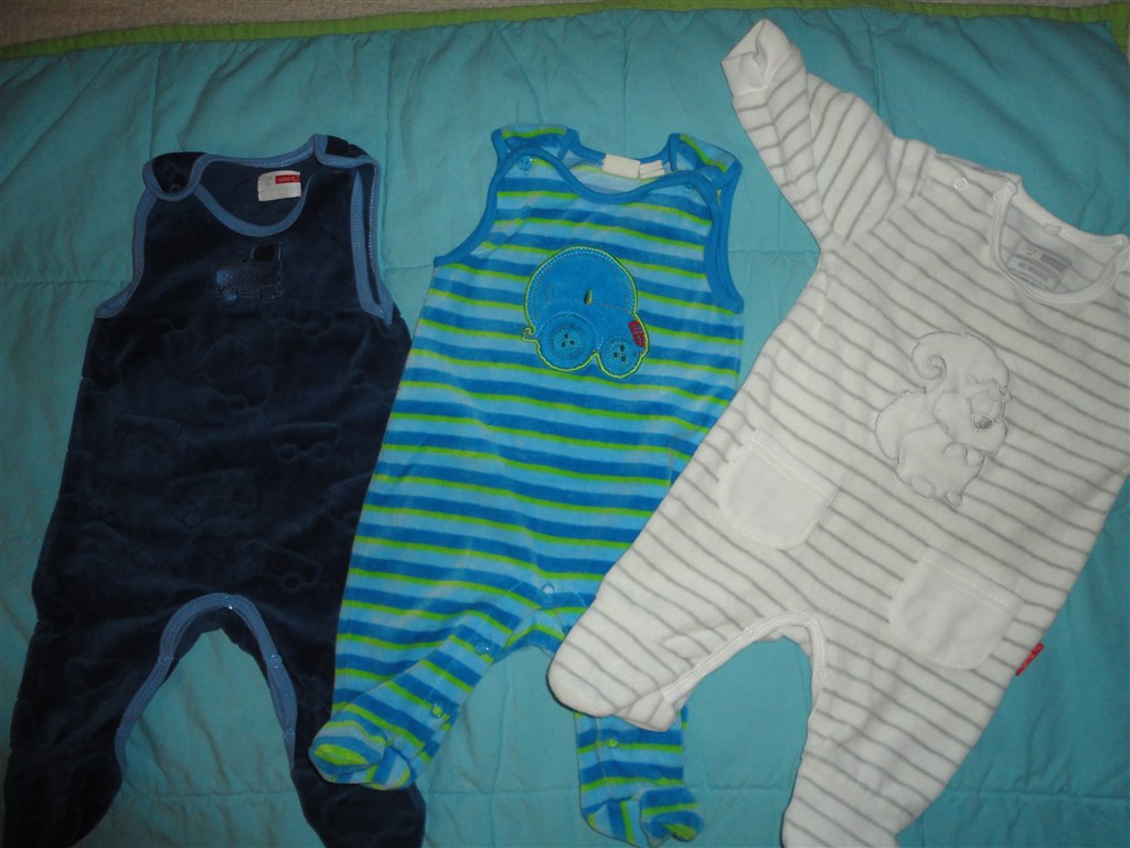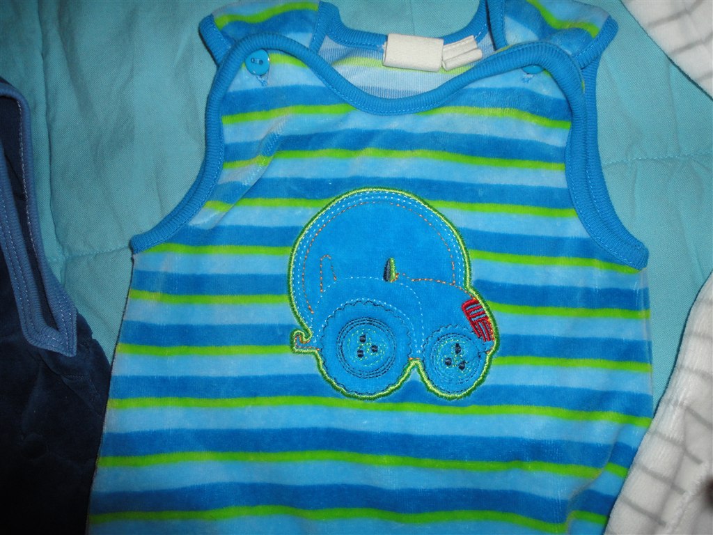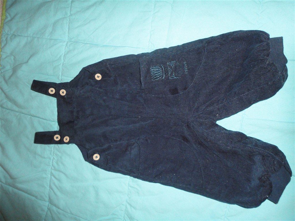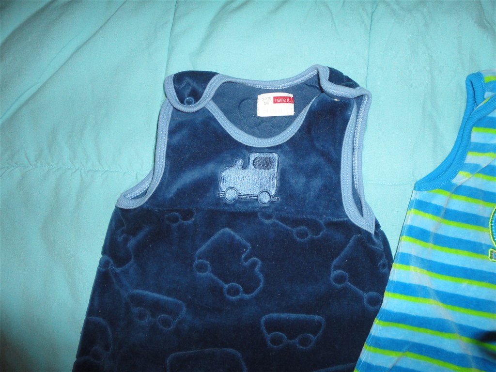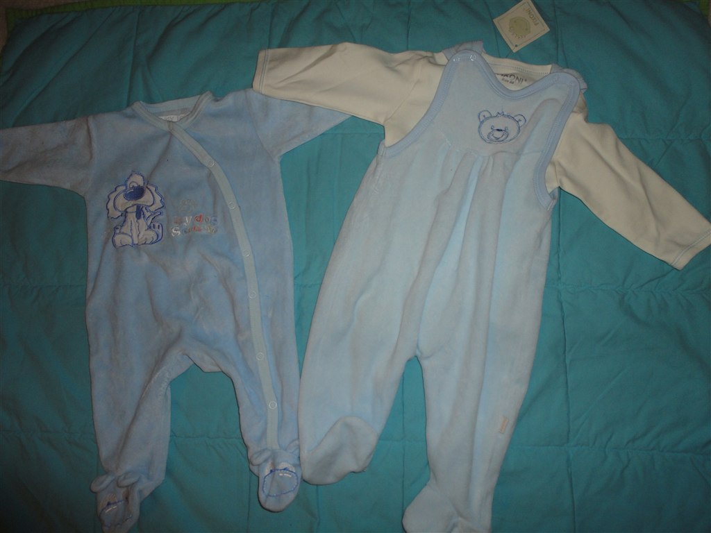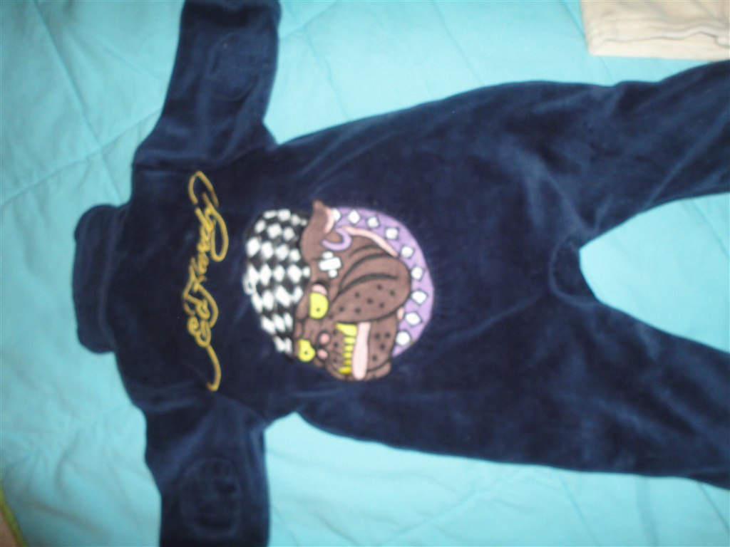 Den blå er en dragt i mærket Ed Hardy. Købt i USA. Der står str. 3-6 mdr, MEN er nok nærmere en str. 56 (Min dreng er nu også stor i det.) Brugt flere gange. Vasket ca. 4 gange. Billedet af det store hundehoved er på ryggen af dragten. Sele bukserne er fra Benneton str. 62., De er ubrugte.