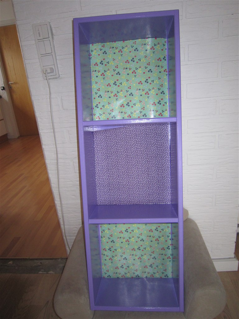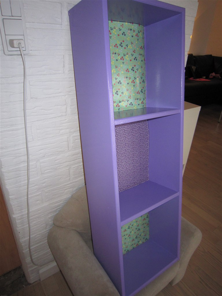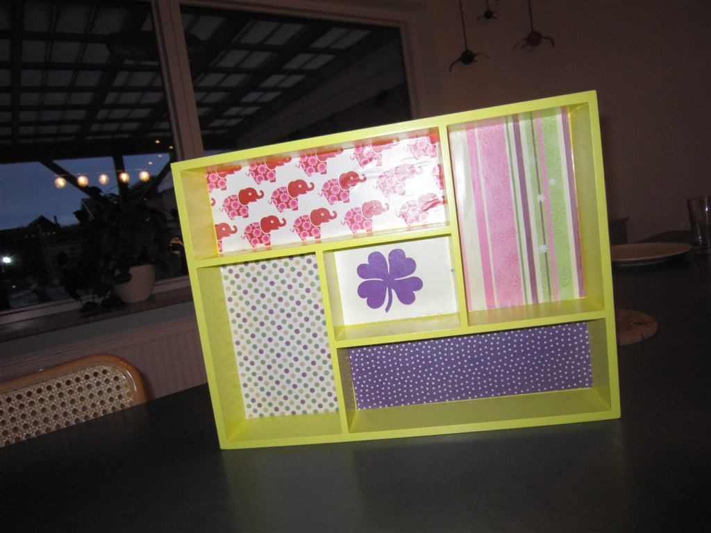 Billede 1 + 2: Bogkasse fra jem&fix malet og tapseret med tapet og gavepapir (den mangler og blive lakeret)