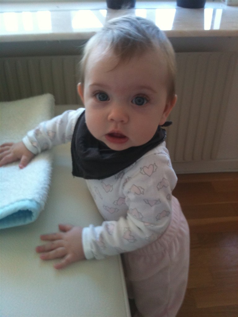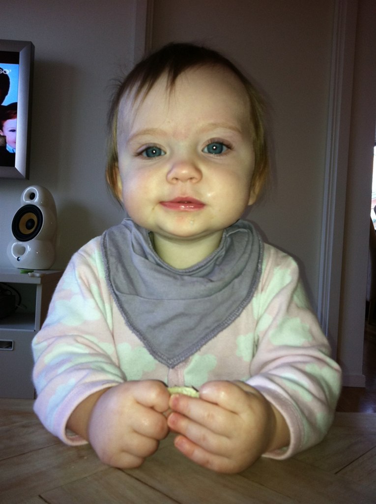 Malou spiser en skål grød om morgenen, 1/2 banan omkring kl.10 oppe i dagplejen, 1/2 stykke rugbrød til frokost med pålæg på i dagplejen, nogle gange kiks, frugt, fignestænger eller lidt yoghurt når hun kommer hjem kl.15 og så meget lidt aftensmad om aftenen.... Og så to flasker mælk... en til at sove på og en om natten (nogle gange springer vi over)...