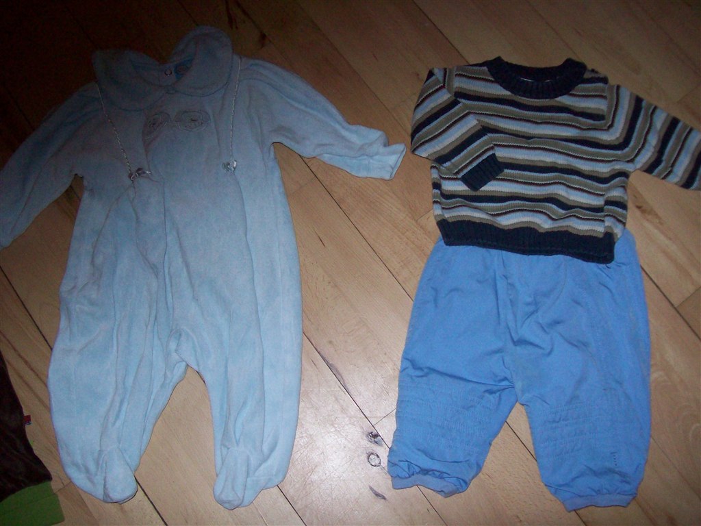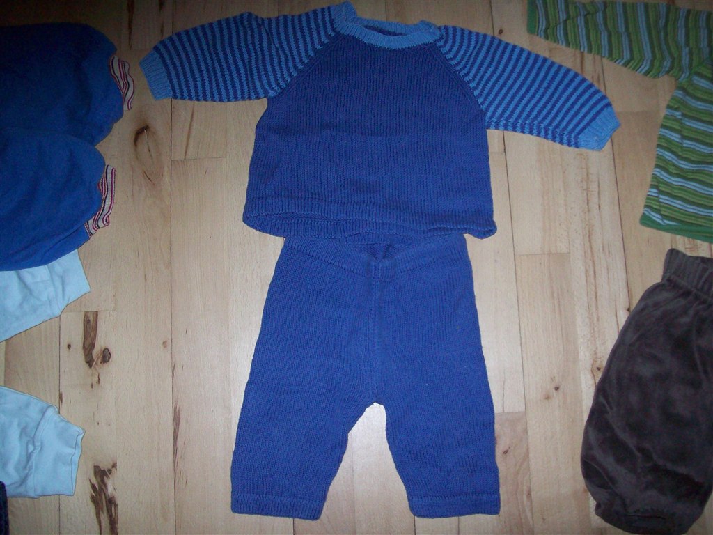 Billede 1: Heldragt 30 kr, sæt med blå bukser og strik 45 kr.