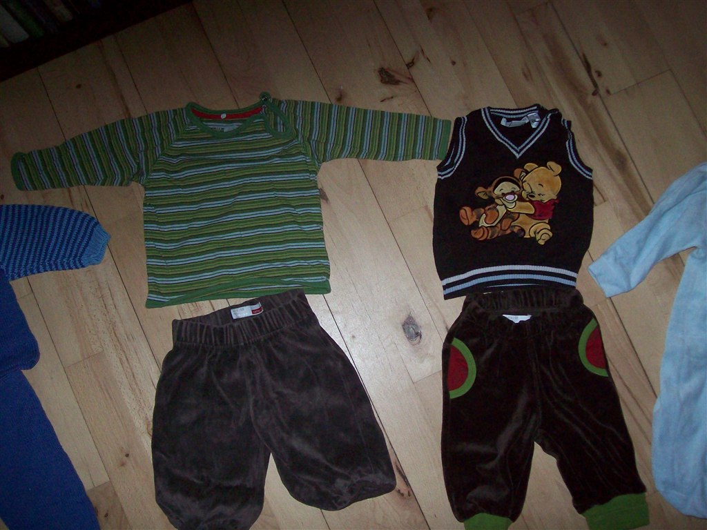 Billede 2: Sæt med stribet bluse og brune velourbukser 50 kr. Sæt med Peter Plys og velourbukser 65 kr.