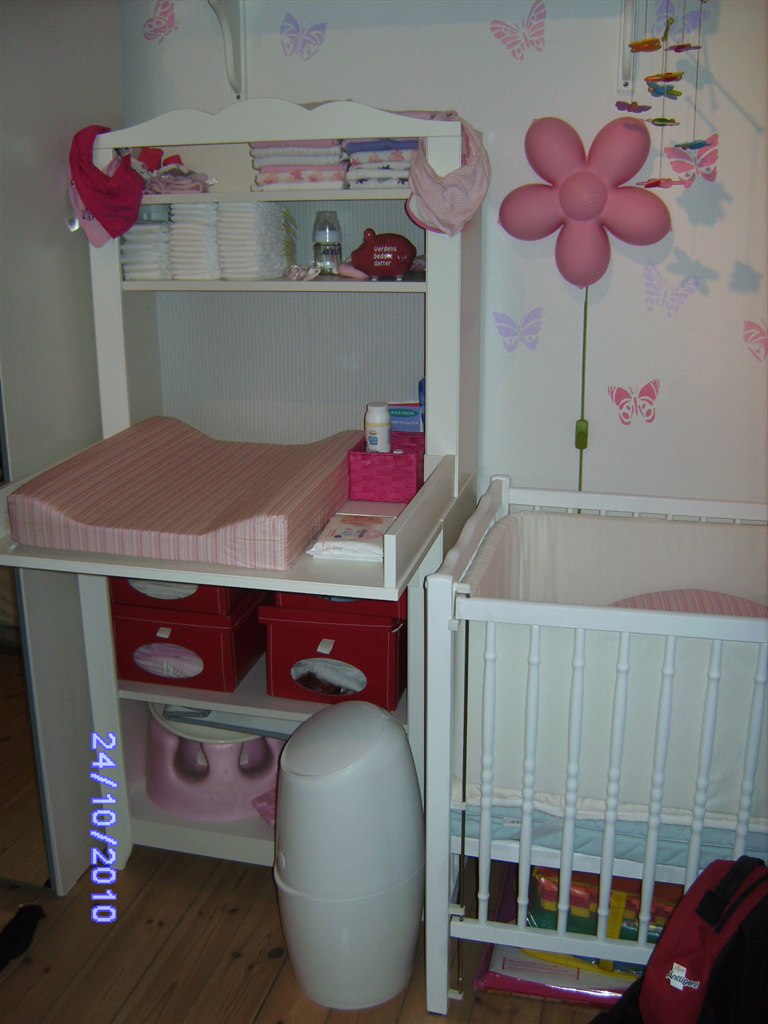 Nu er vi efterhånden ved at være så langt, at vi skal have sat børneværelset i stand. Jeg har lidt svært ved at finde en løsning på puslebord/kommode, nok allermest fordi jeg ikke har fundet den det liigge skal være.