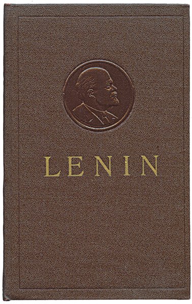 Lenins samlede værker på engelsk. Indbundet udgave i brunt læder med guldtryk og Lenins portræt præget i skindet. 575 kr