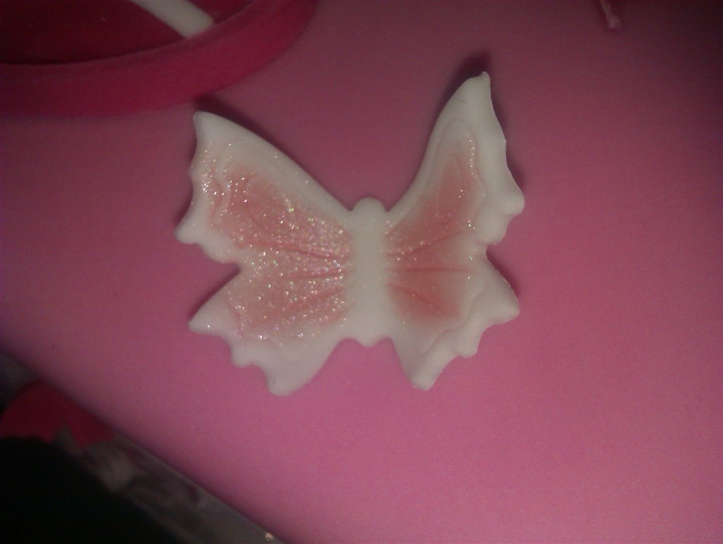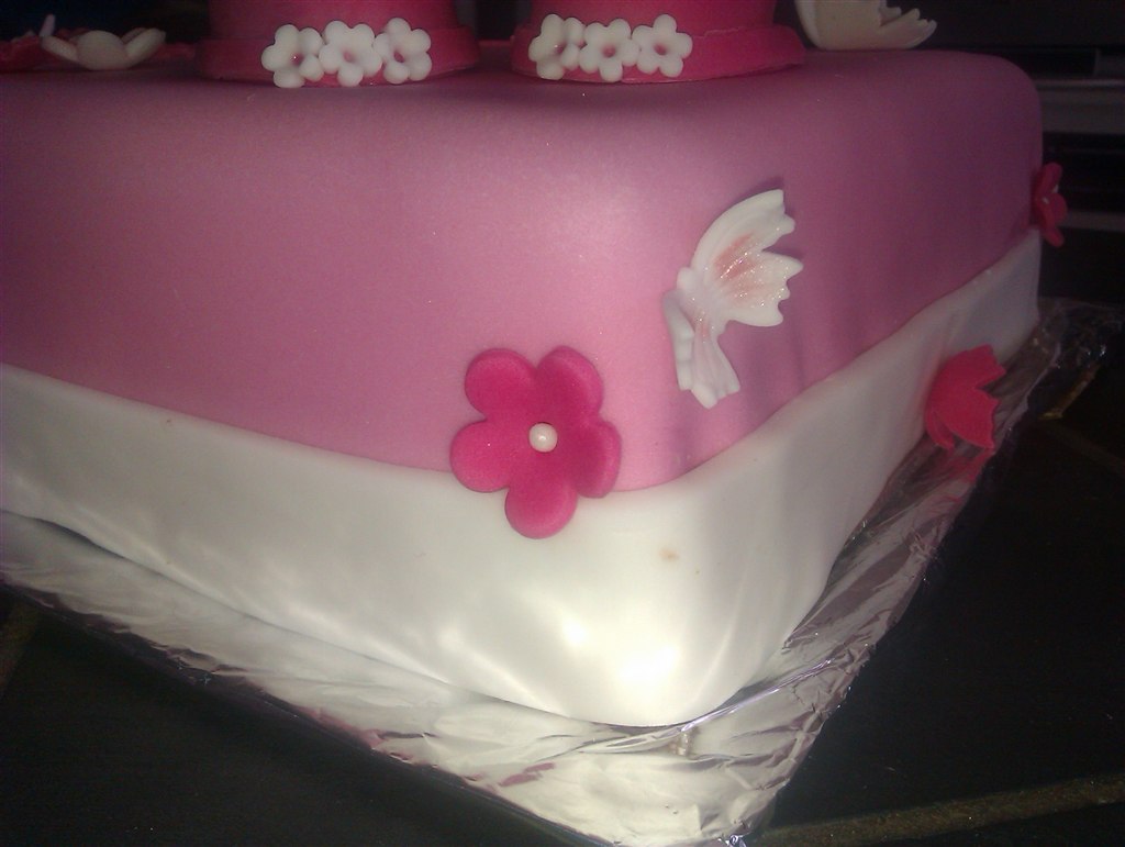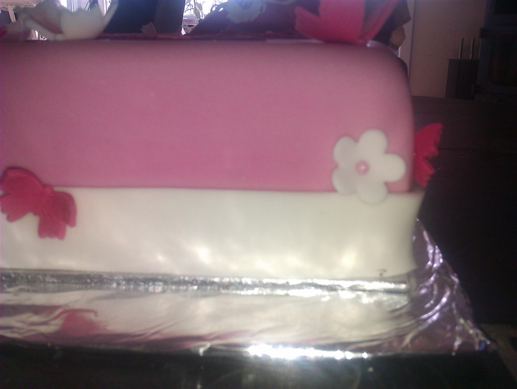 Lavet med lysebunde med hindbærmousse og pæremousse, smurt op med psc og med lyserødt fondant.