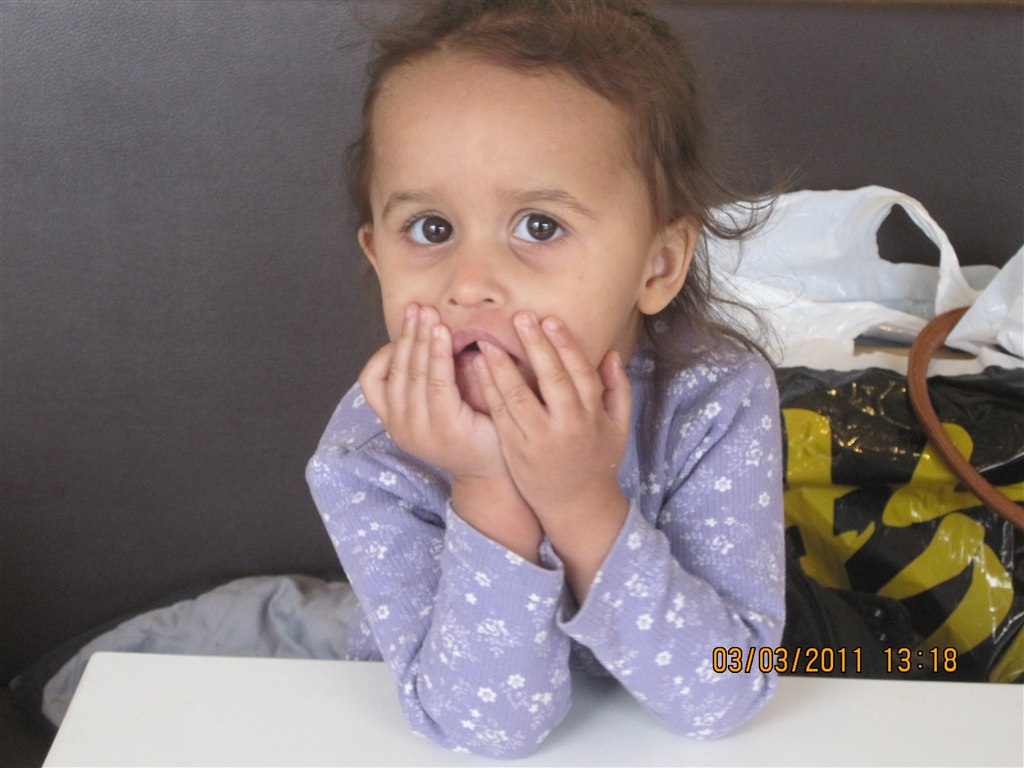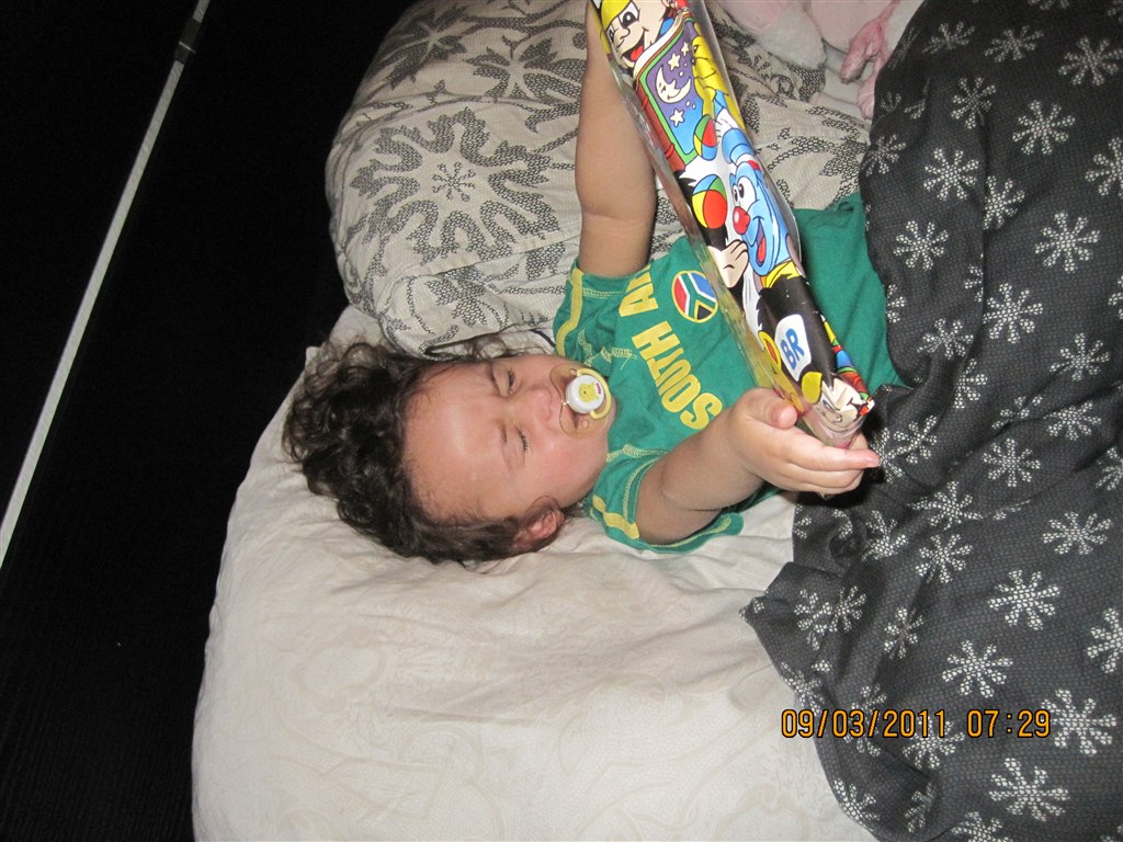 Da vi vækkede hende imorges med sang, sagde hun "moar put nu" hehe men vågnede da hun så der var gaver