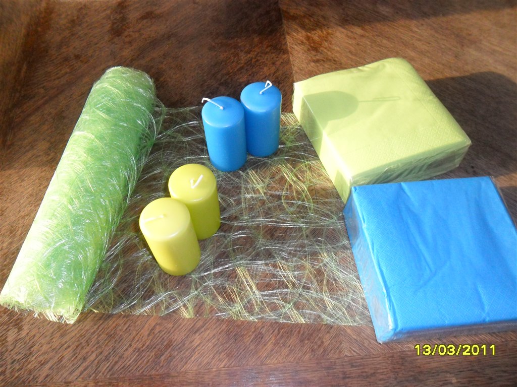 3): Så er der købt lys og servietter i ens farver - bordløberen kunne jeg ikke finde i helt matchende farven, men det går nok! (der skal i øvrigt en cremefarvet velourdug på bordene, men det er min bedstemor der står for det