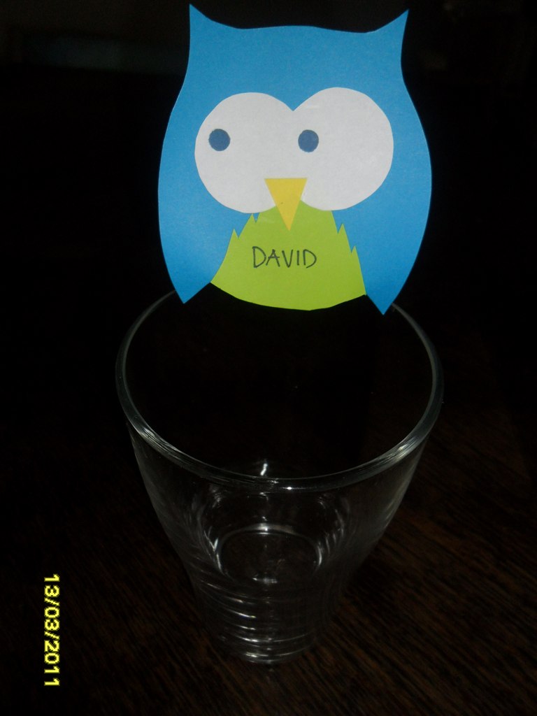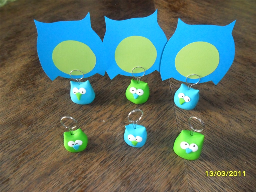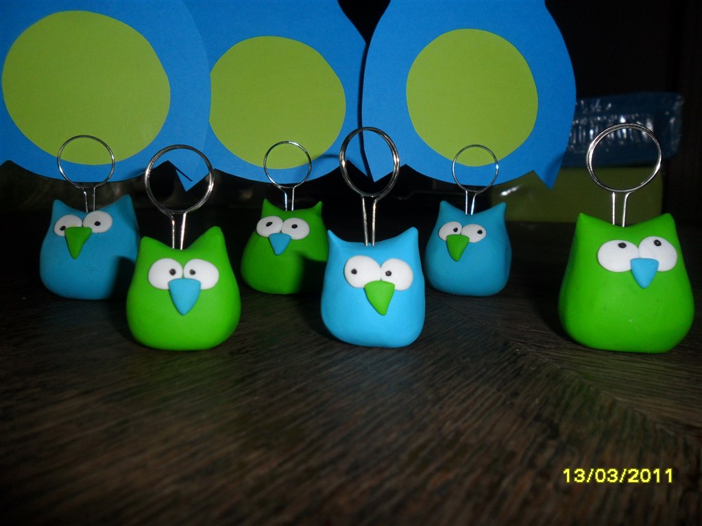 4) +5): De små kortholder-ugler er lavet af fimo-ler og skal sætte ved tærterne, så man kan se hvad der er i de forskellige (bemærk det er samme skabelon som bordkortene