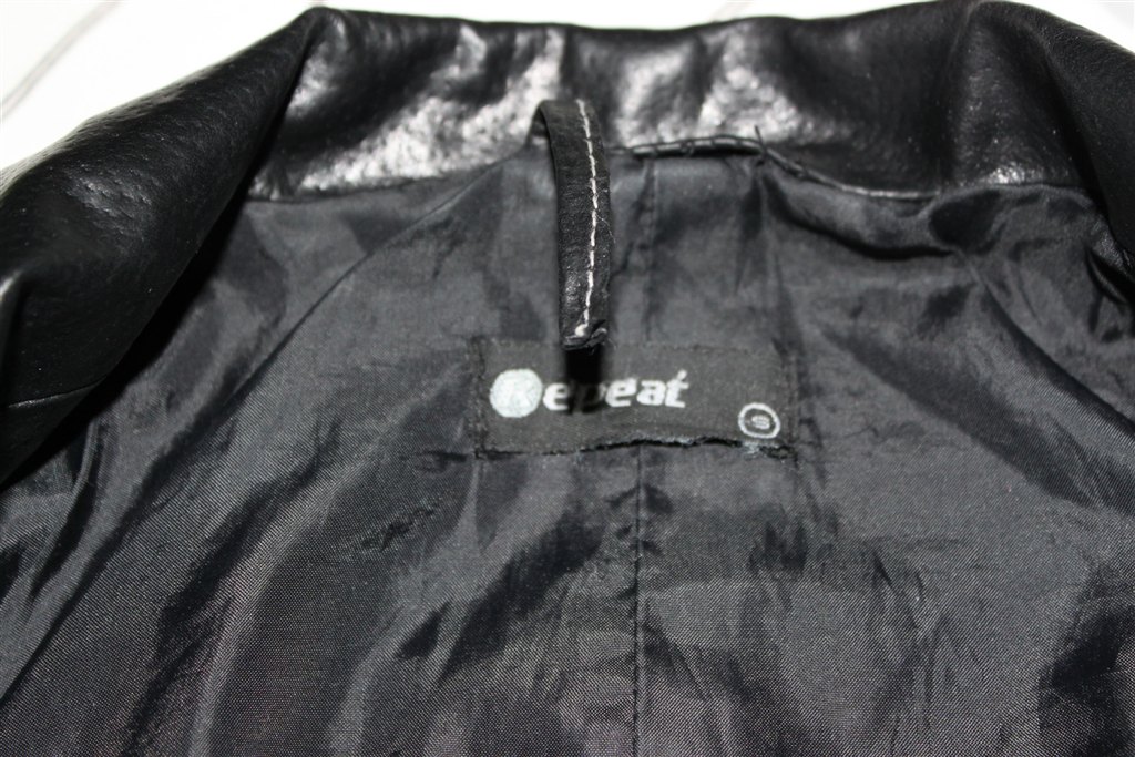 Lækker sort skindjakke fra Repeat (se billede 1). Real leather. Str.S. Har et lille hul ved den ene lomme (se billede 5). Stroppen til at hænge jakke i, er røget af i den ene side (se billede 6). Bortset fra ovenstående er den pæn & velholdt. 100 kr. Billede 1. SOLGT