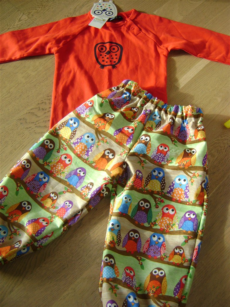 bullerbassen skriver: Så fik jeg syet Silas's bukser færdig Sørme om jeg ikke fandt en sød ugle trøje der passer til. ( håber ikke det er for piget ) Så er han klar til fest